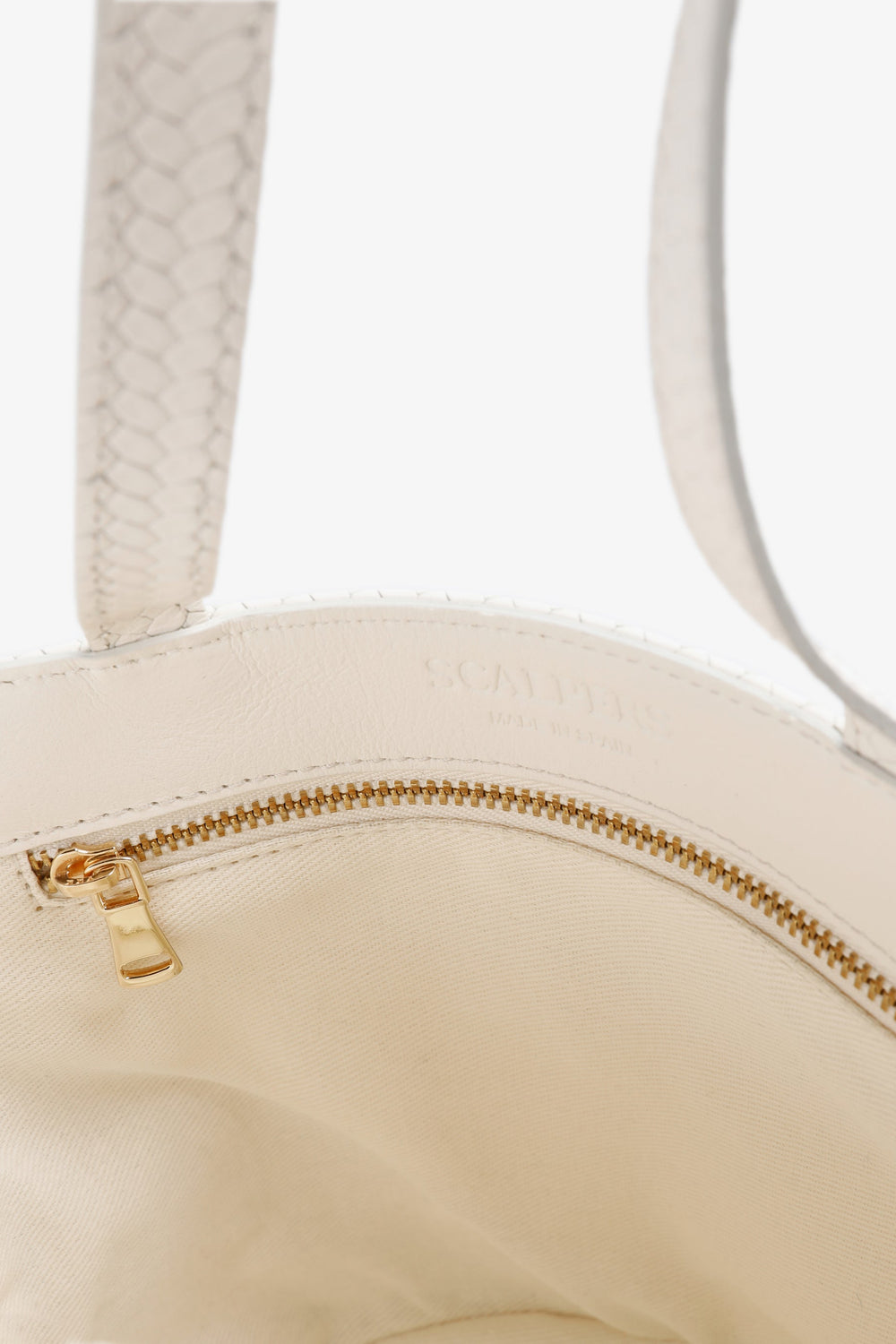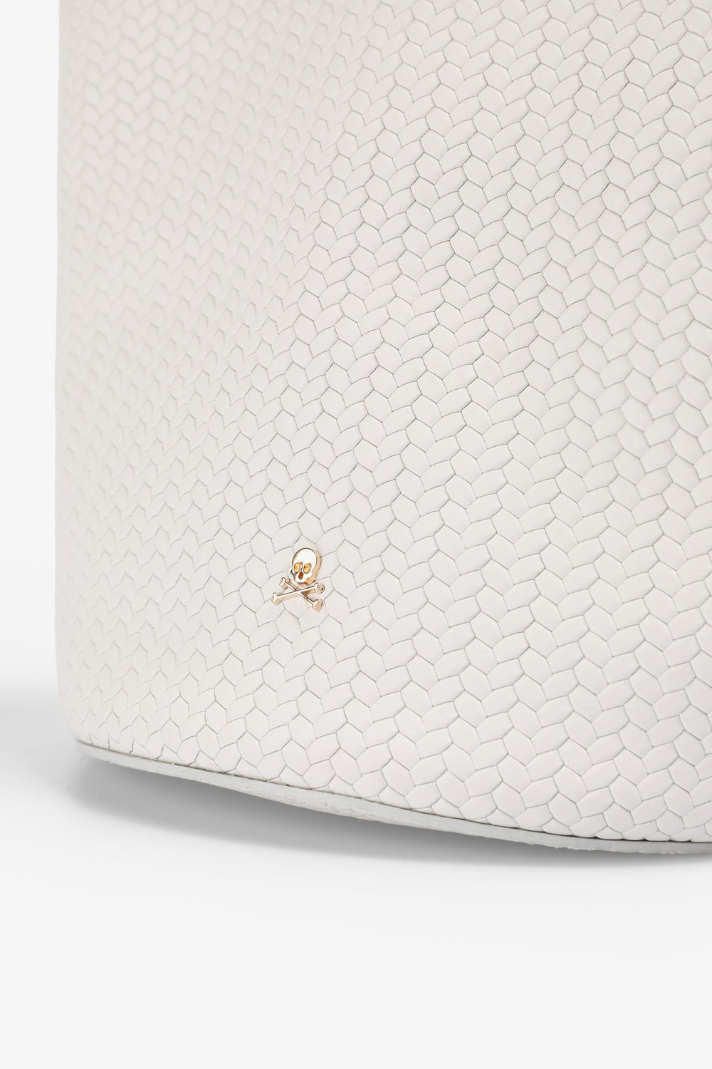Bucket bag made of braided 100% leather. Inner lining with zipped pocket. Rubberised logo detail on the front. Short strap.