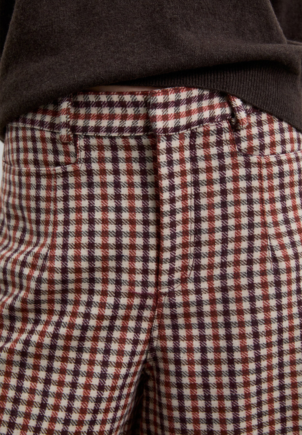 Culottes with check print. Front dart detail. Four pockets. Zip and button fastening.