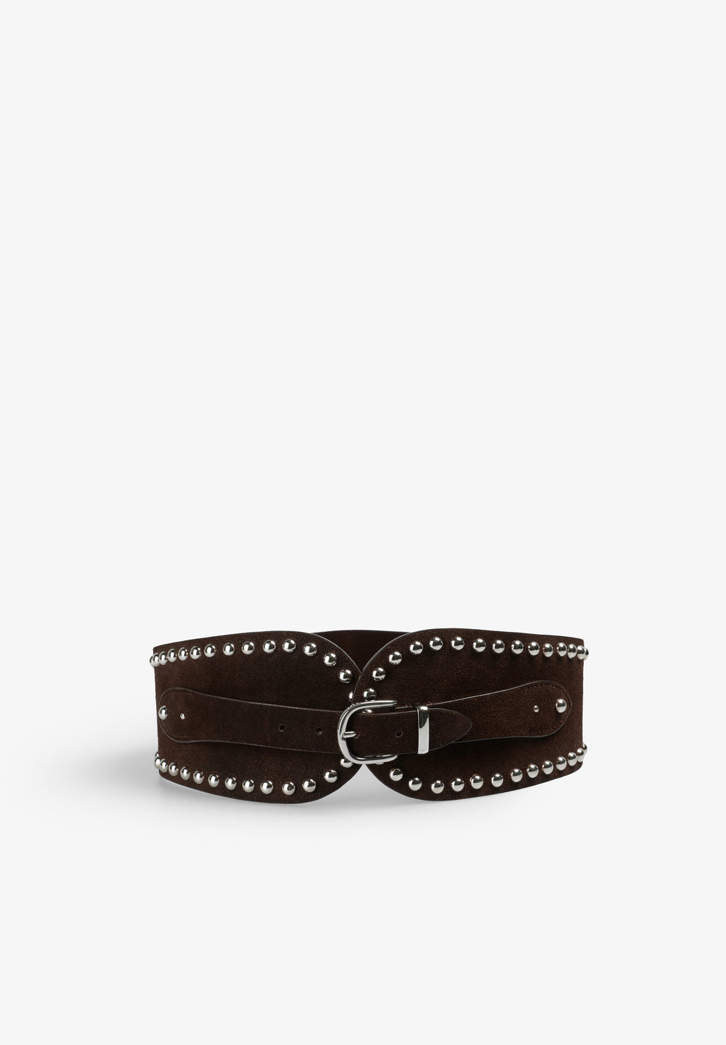 Sash belt made of 100% cowhide leather. Metal buckle. Studded detail at the top and bottom. Adjustable.