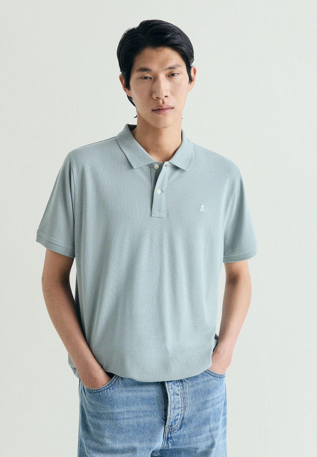 Polo shirt in 100% BCI cotton. Regular Fit. Polo shirt collar with buttons. Short sleeve. Faded effect. Embroidered contrast skull on the chest. Ribbed trim.
