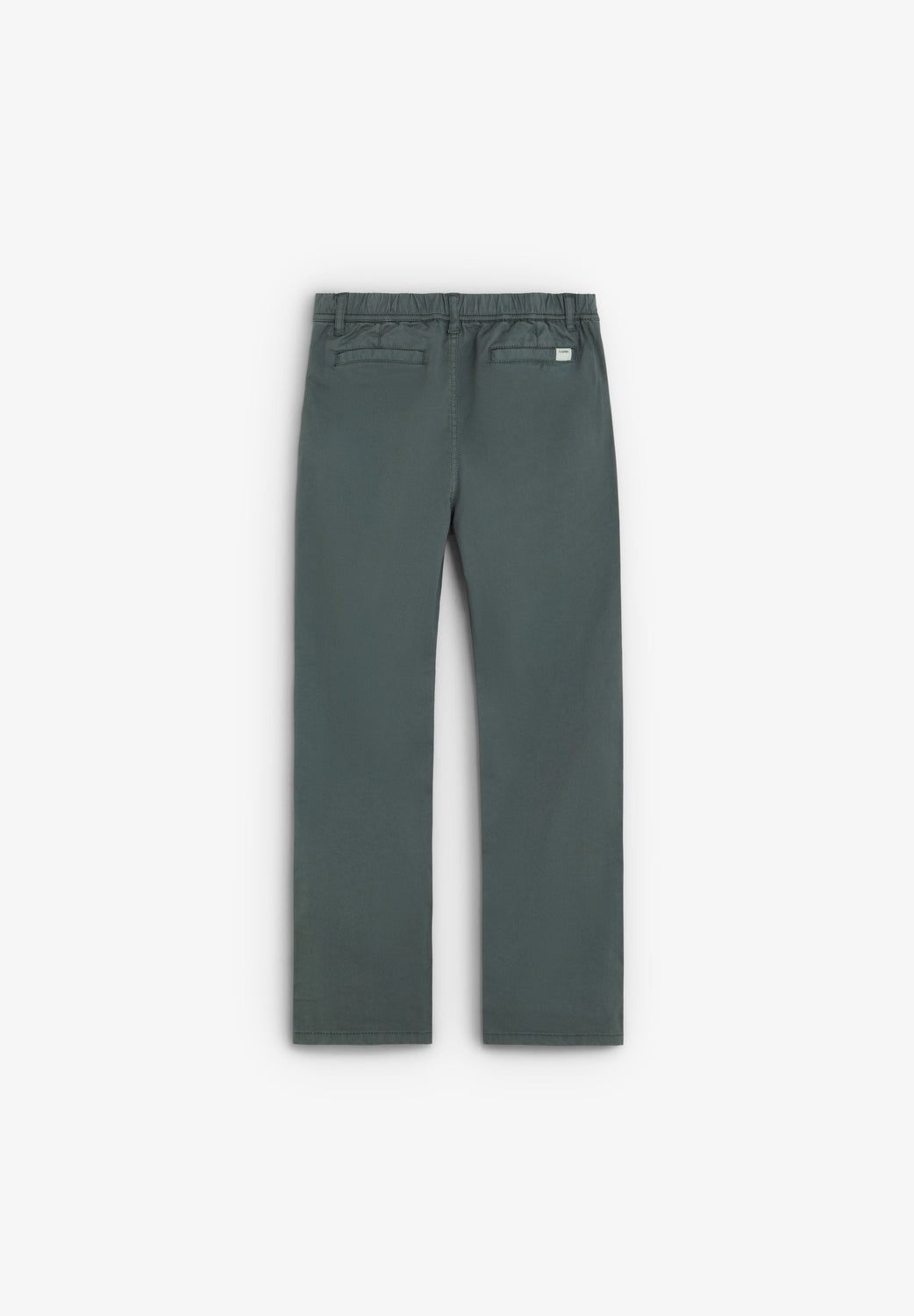 Trousers made of slightly stretchy BCI cotton. Relaxed fit Slightly elasticated belt loops. Side pockets. Button fastening.