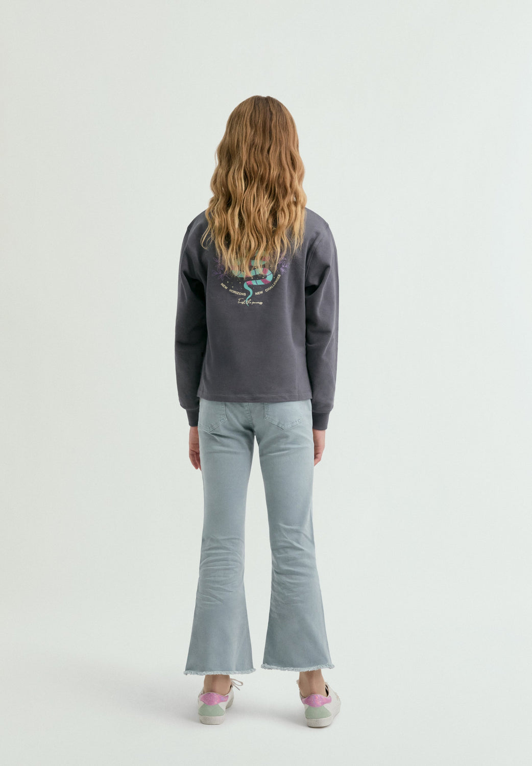 Flared trousers made of cotton. Front button and zip fastening. Belt loops at the waist. Patch pockets on front and back. Slightly flared leg from the knee. Frayed finish on the hems. Front seams. Tonal embroidered detail on left front pocket.