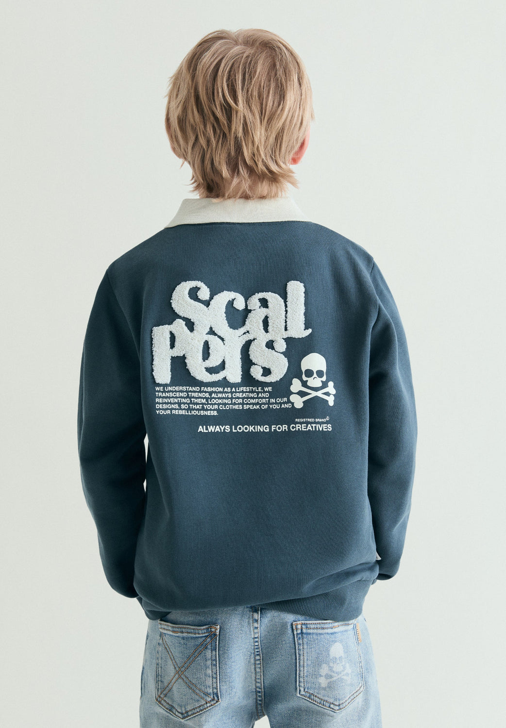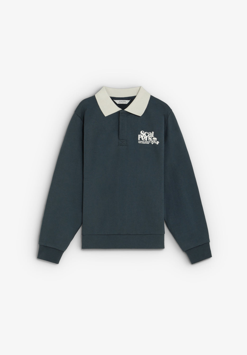 Sweatshirt made of 100% cotton. Contrast polo shirt collar. Long sleeves. Back print with faux shearling. Chest print detail. Ribbed trim