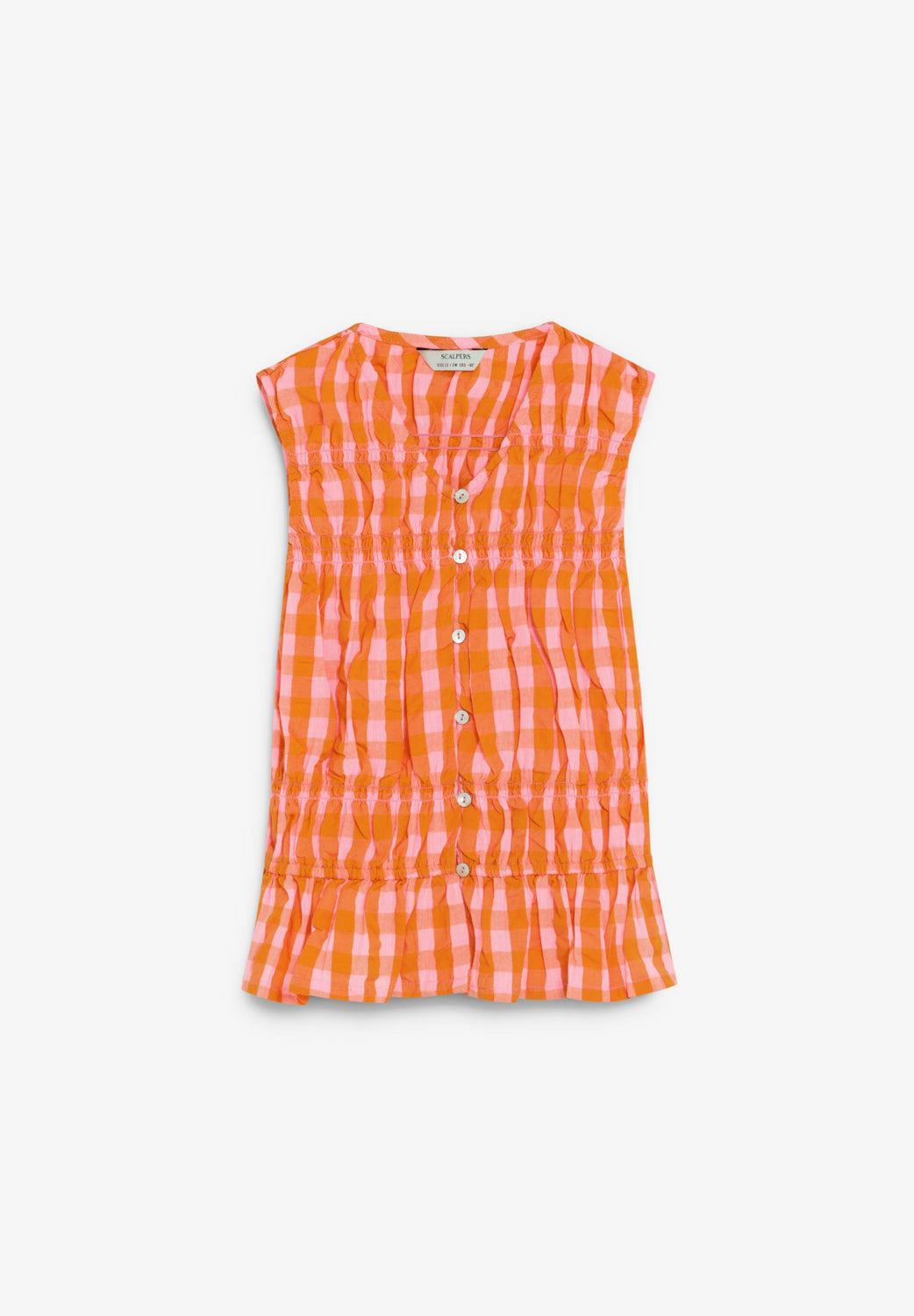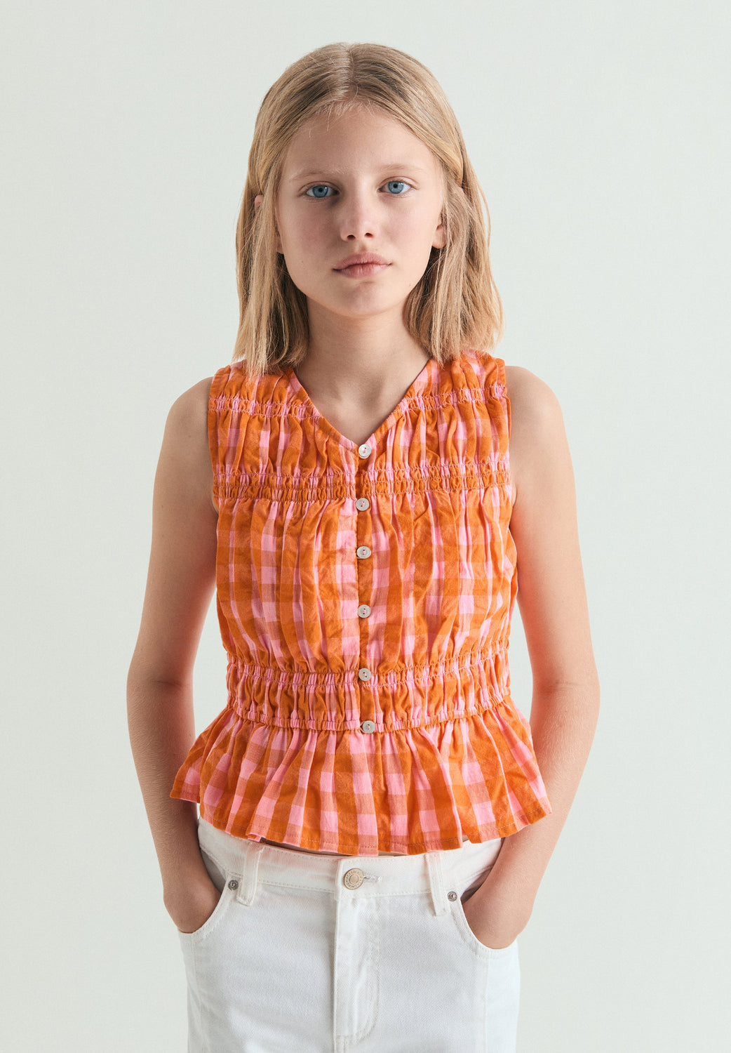 Top made of 100% cotton. Gingham print. Regular Fit. V-neck, sleeveless design. Front button fastening. Gathered detail.