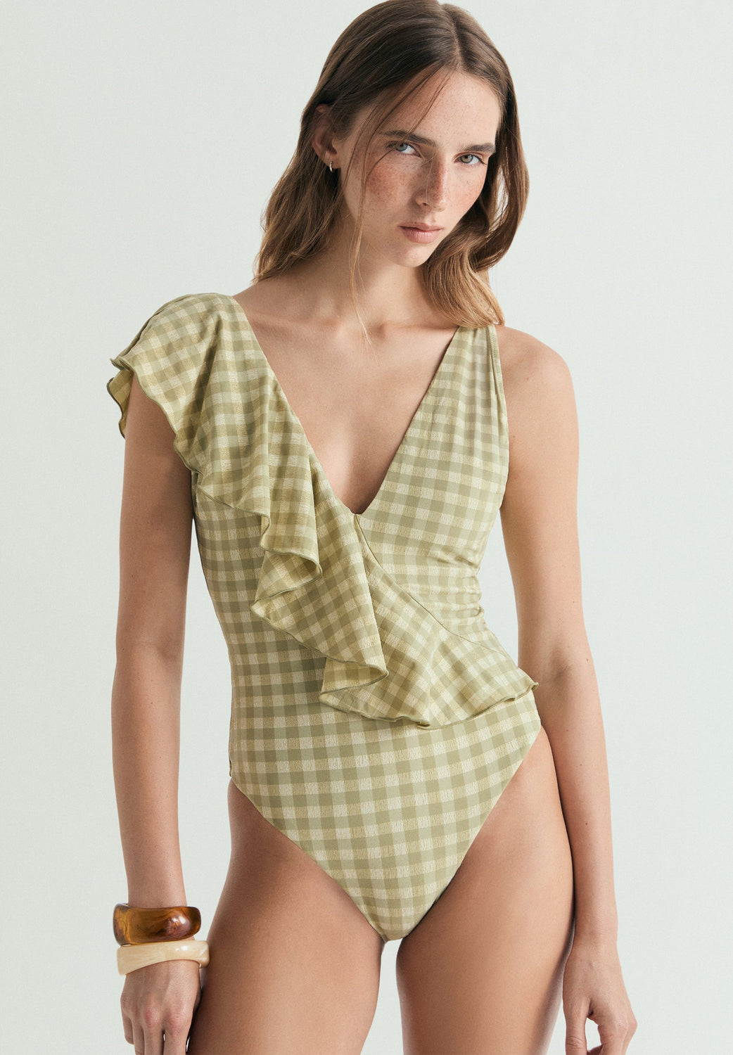 Swimsuit made of elastic fabric with metallic thread on the yoke and gingham print. Lined. V-neck and diagonal ruffle on the front. Back V-neck.