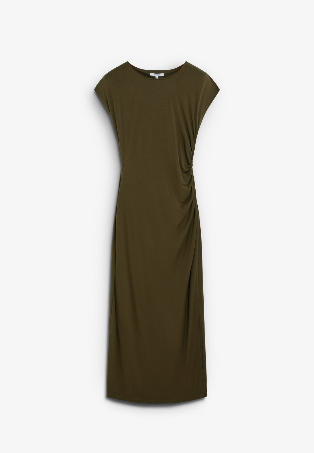 Dress made of cupro fabric. Slim fit, round neck and short sleeves. Gathered detailing on waistband. Midi length.