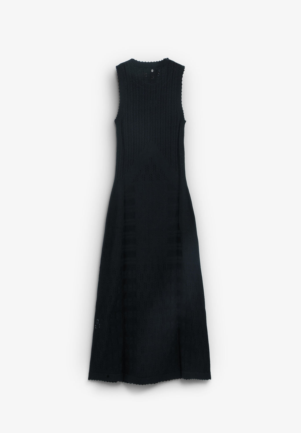 Dress made of a cotton blend. Slim fit. Openwork knit fabric. Round neck. Sleeveless. Midi skirt. Detailing on the V-neck and hem.