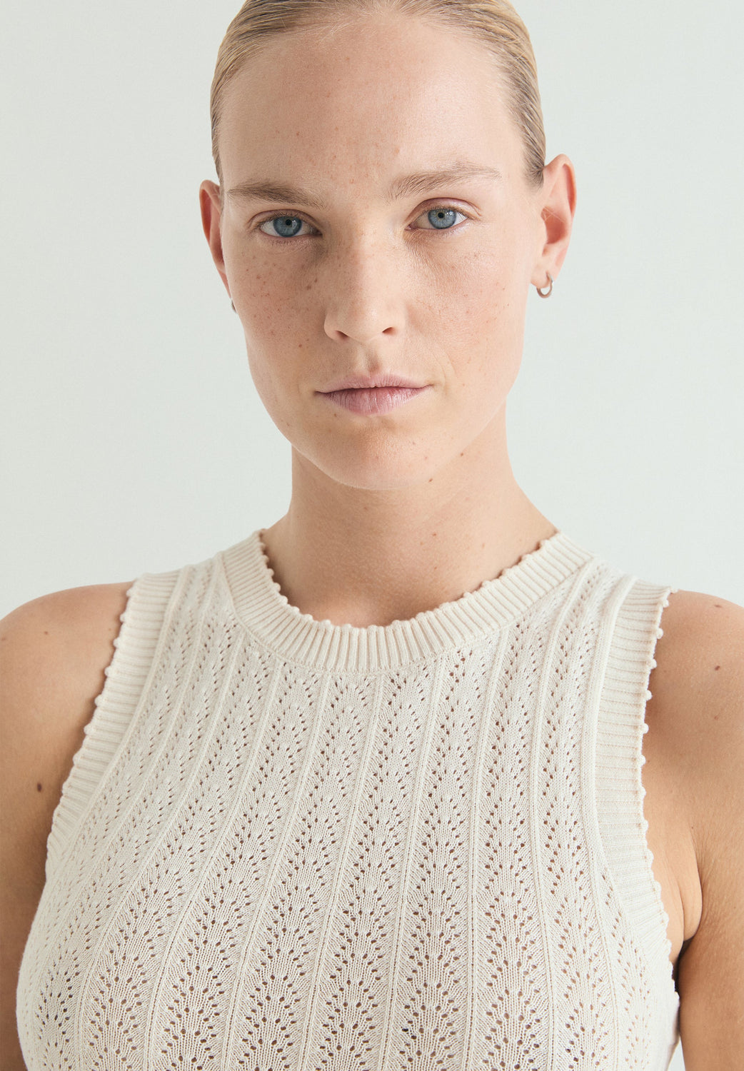 Dress made of a cotton blend. Slim fit. Openwork knit fabric. Round neck. Sleeveless. Midi skirt. Detailing on the V-neck and hem.