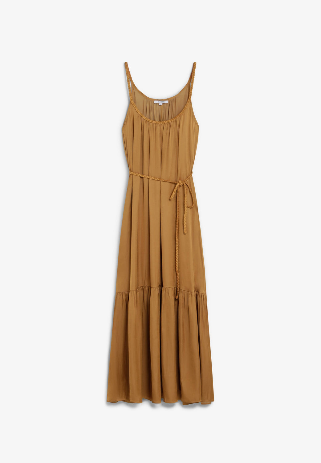 Flowing midi dress with straps. Round neck. Braided detailing on neckline and waist. Gathered ruffle on the hem.