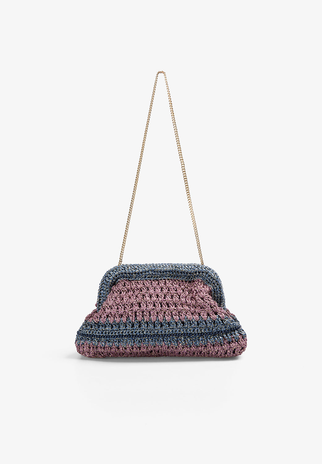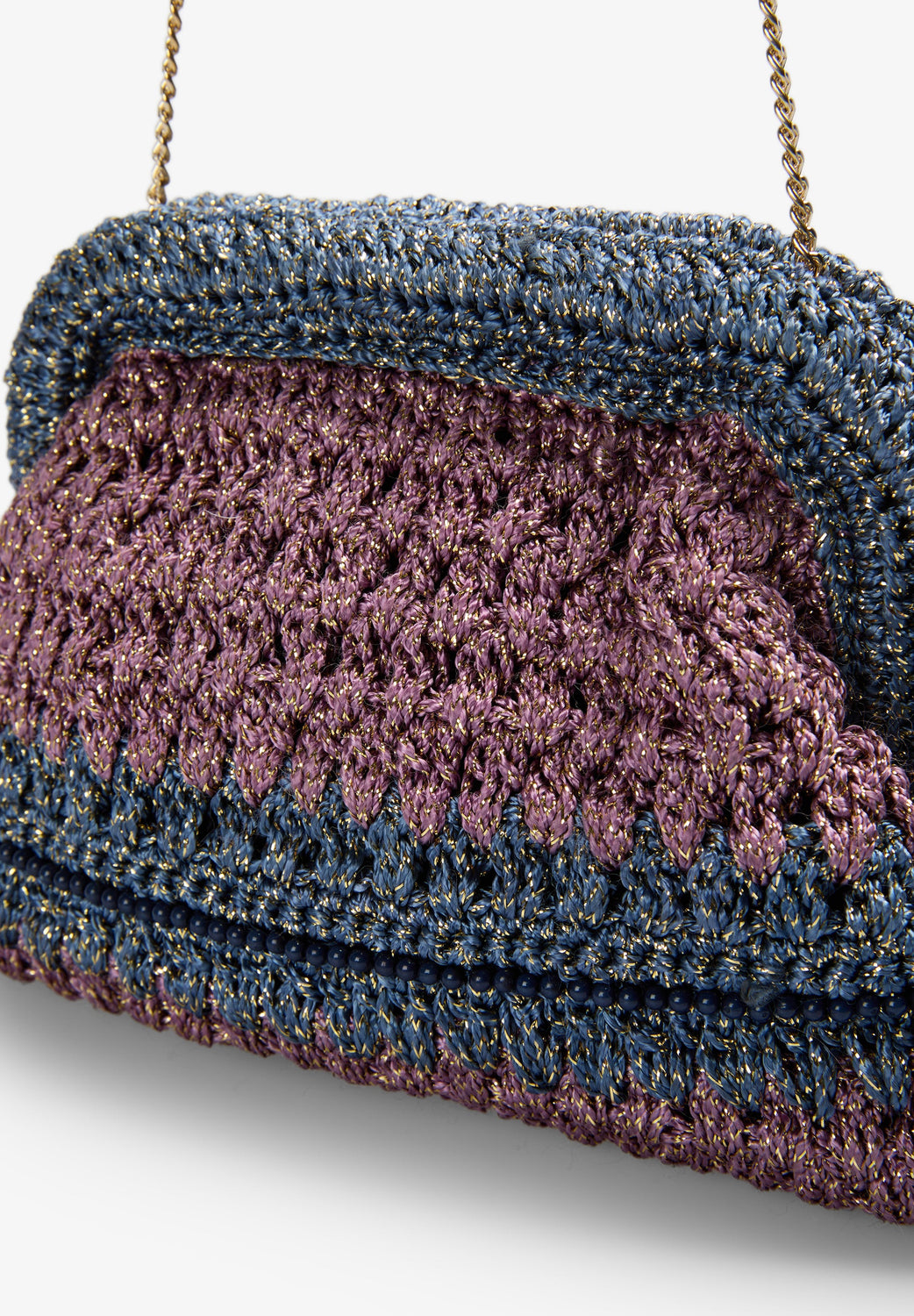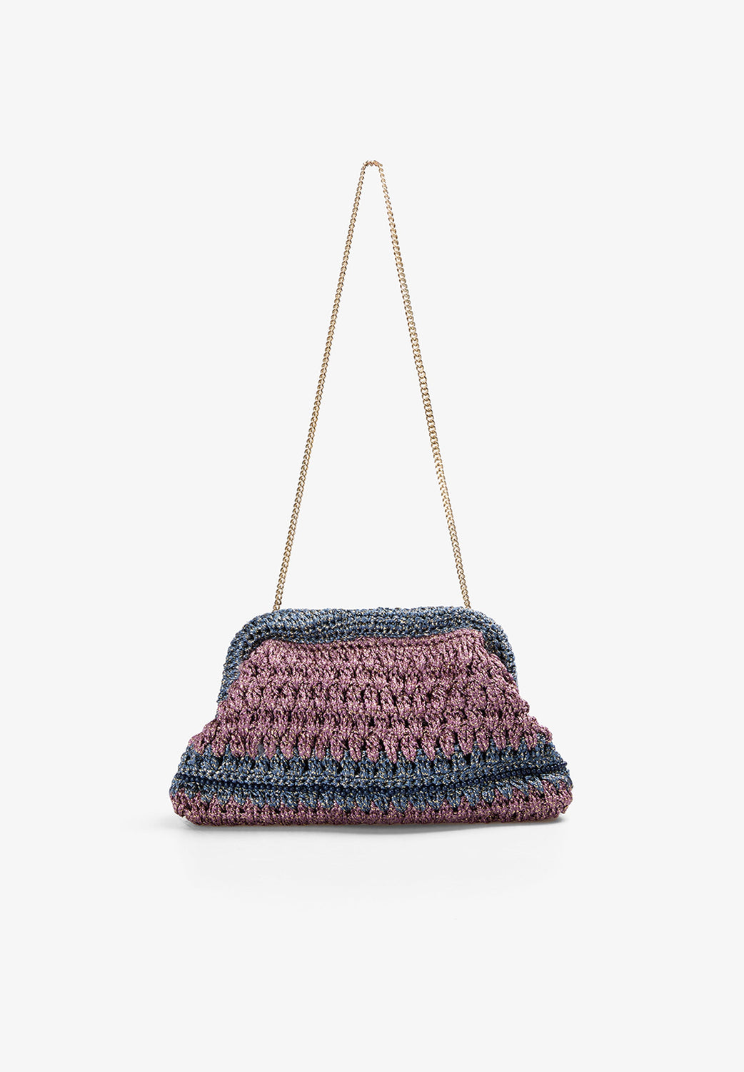 Clutch bag made of braided fabric with metallic thread and beaded detailing. Lined with detachable chain strap inside.