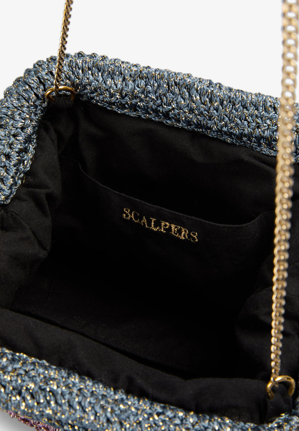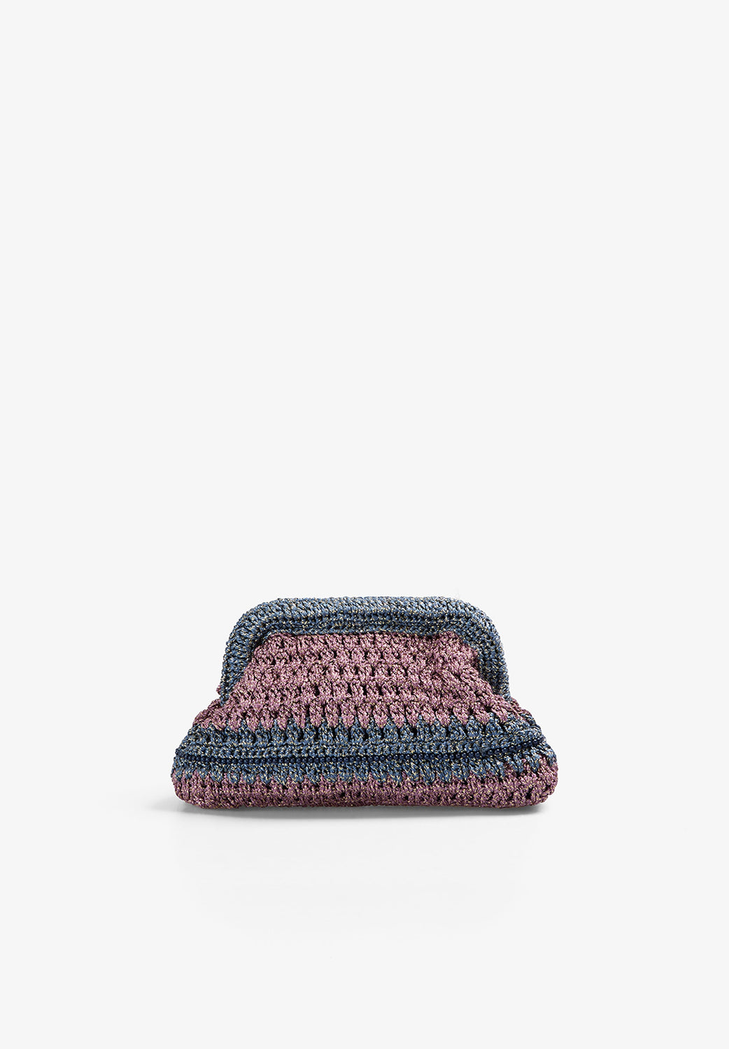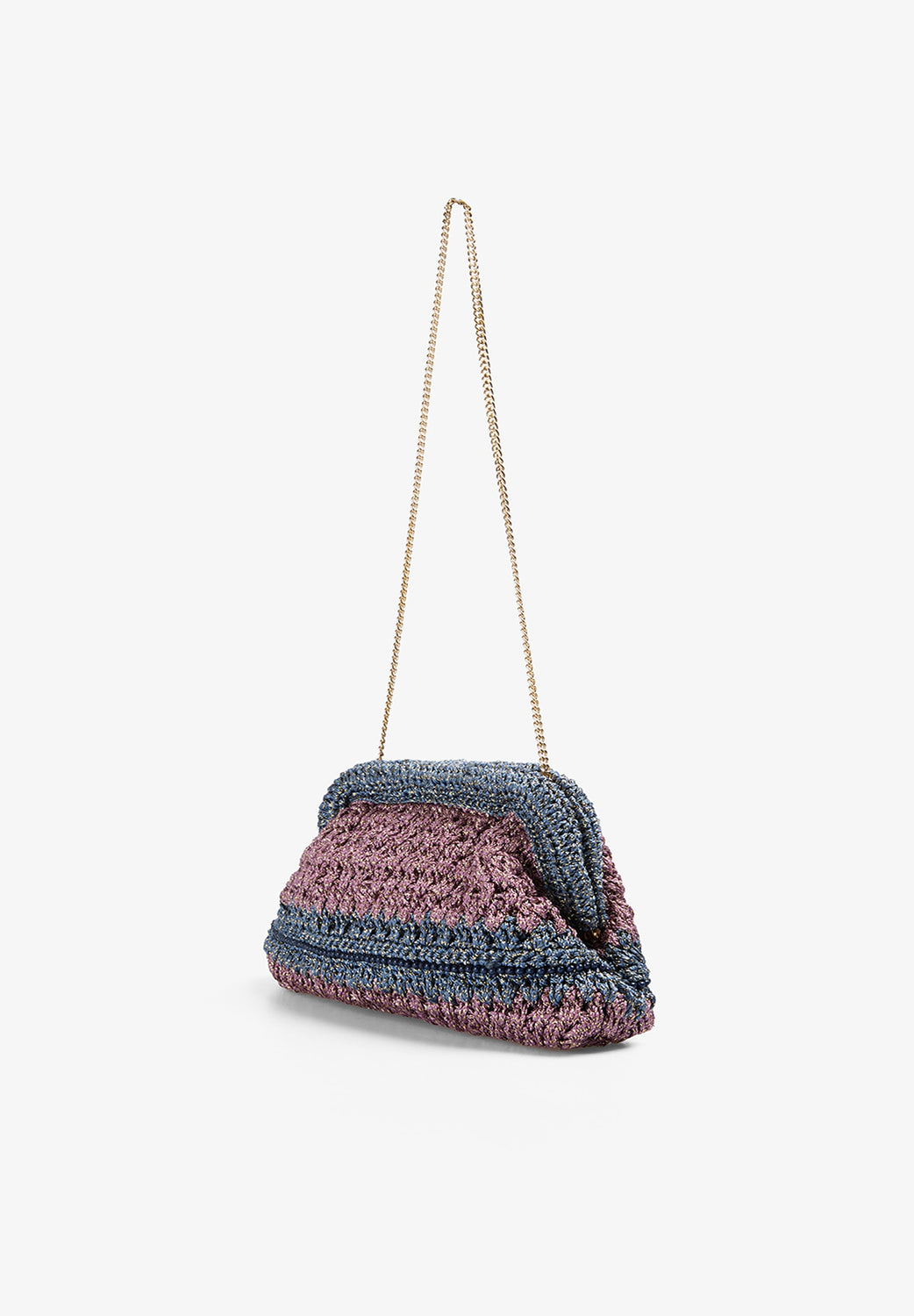 Clutch bag made of braided fabric with metallic thread and beaded detailing. Lined with detachable chain strap inside.