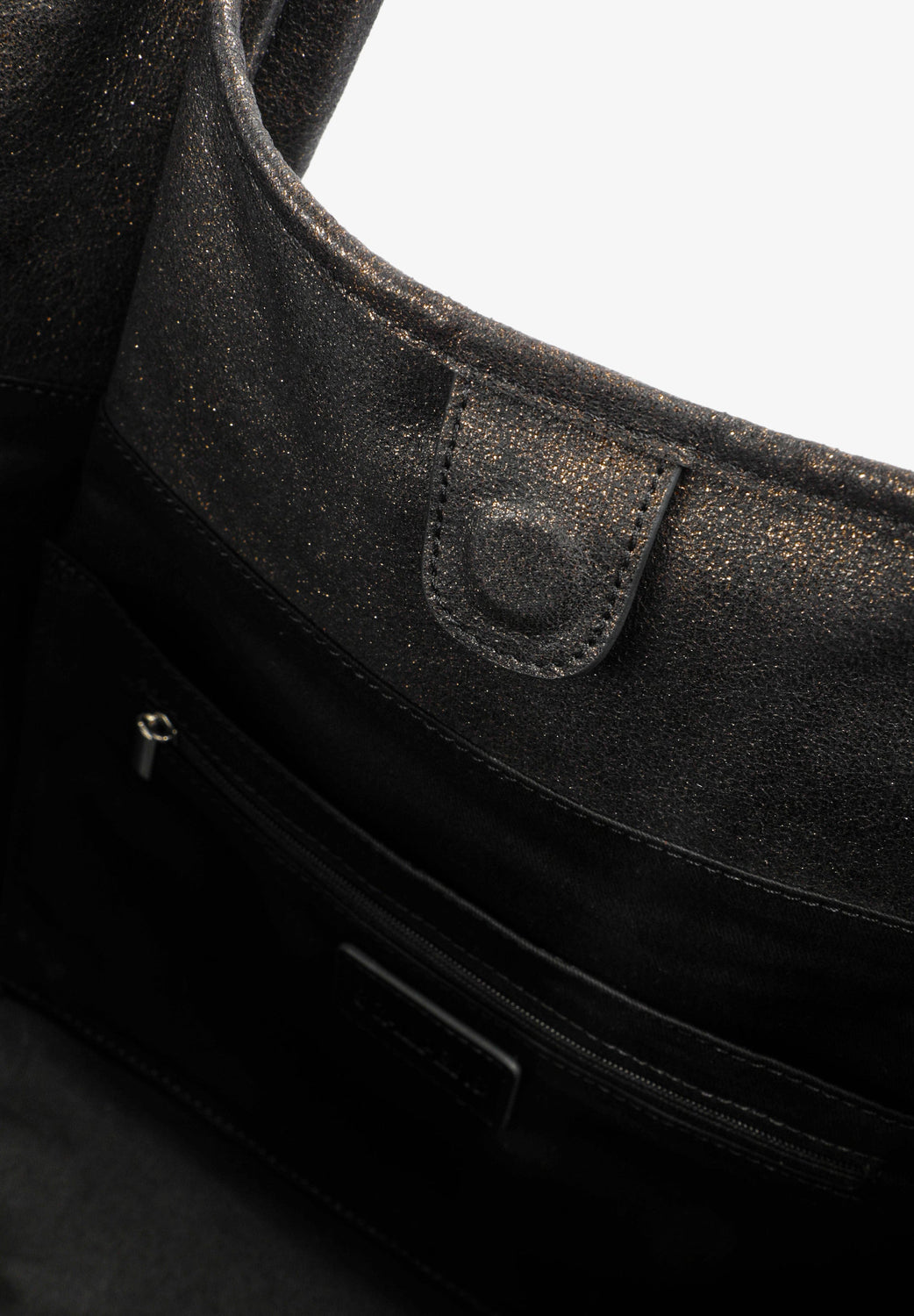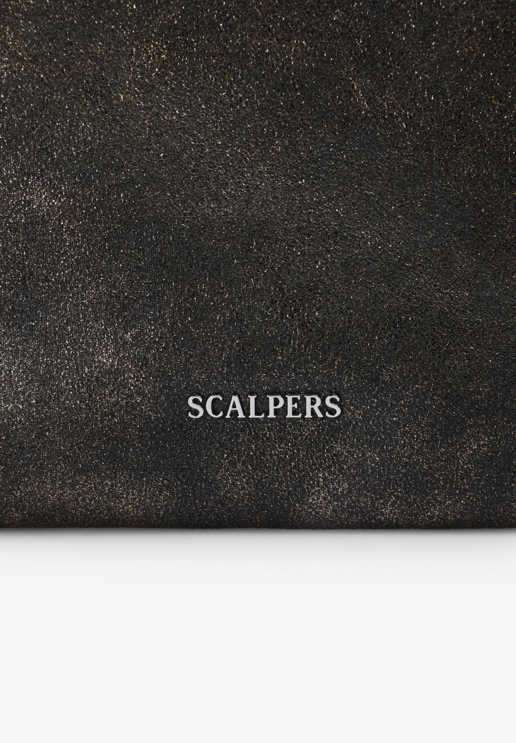 Metallic tote bag made of cotton with worn effect. Inner lining with zipped pocket. Removable matching clutch. Magnetic button fastening. Front logo detail.