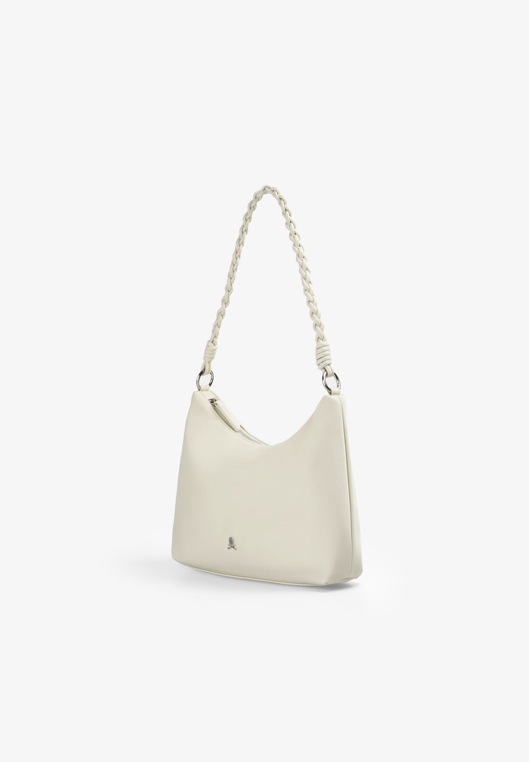 Plain bag with front metal skull detail. Double inner pocket, one with zip. Zip closure. Two handles: a short braided handle and a long strap.