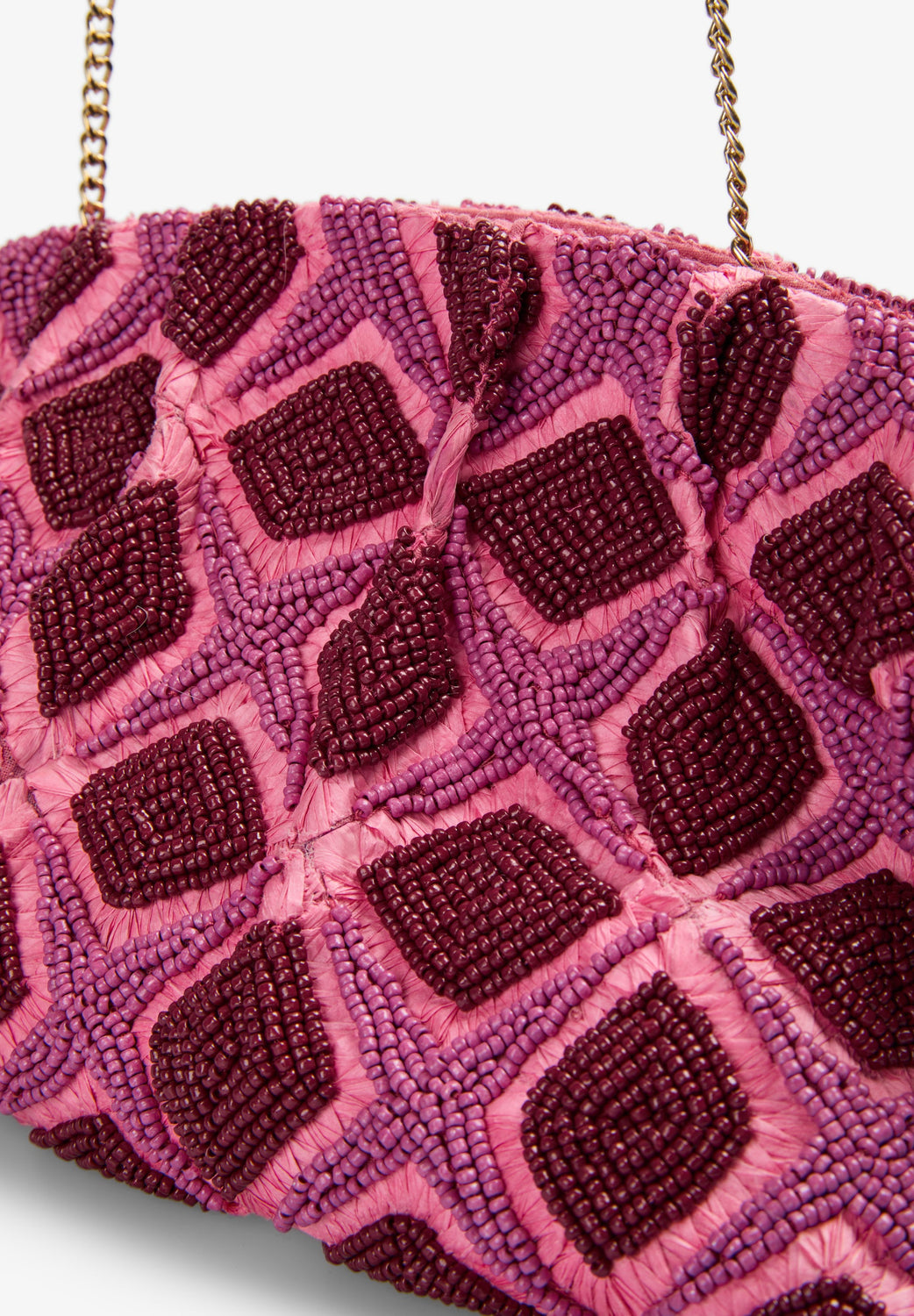 Clutch bag made of cotton with beaded geometric print detail. Lined with detachable chain strap inside.