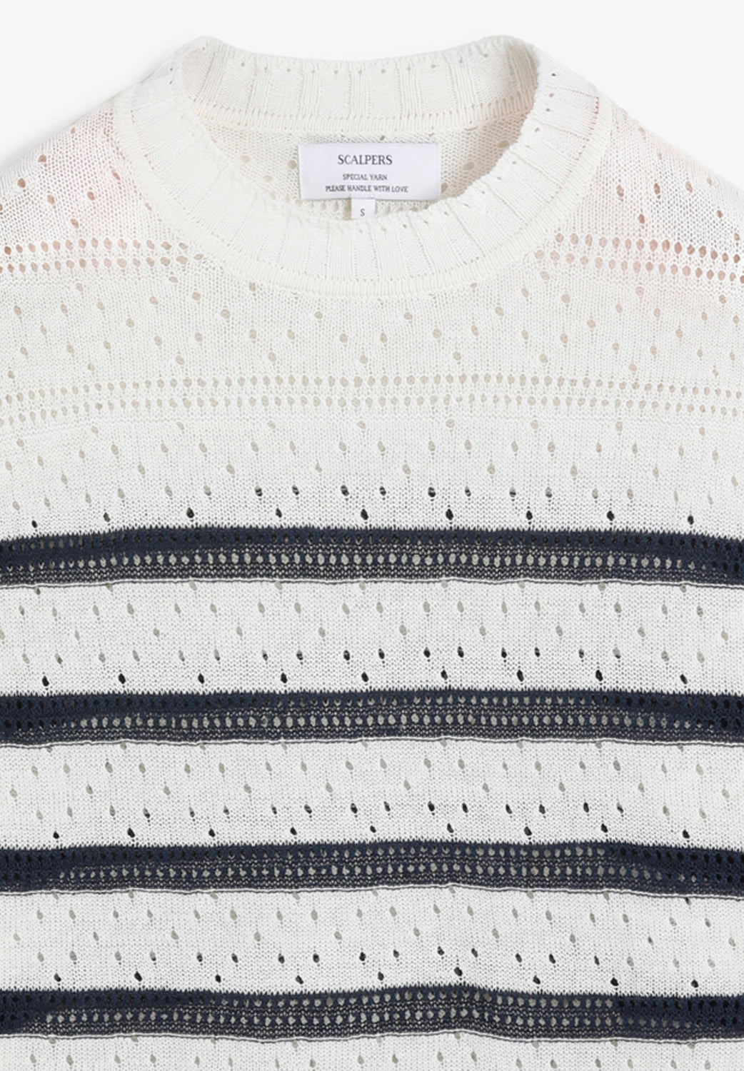 Sweater made of fine openwork knit fabric with horizontal striped print. Loose fit. Round neck with scalloped finish. Long sleeves with ribbed cuffs and vertical line texture. Scalloped hem.