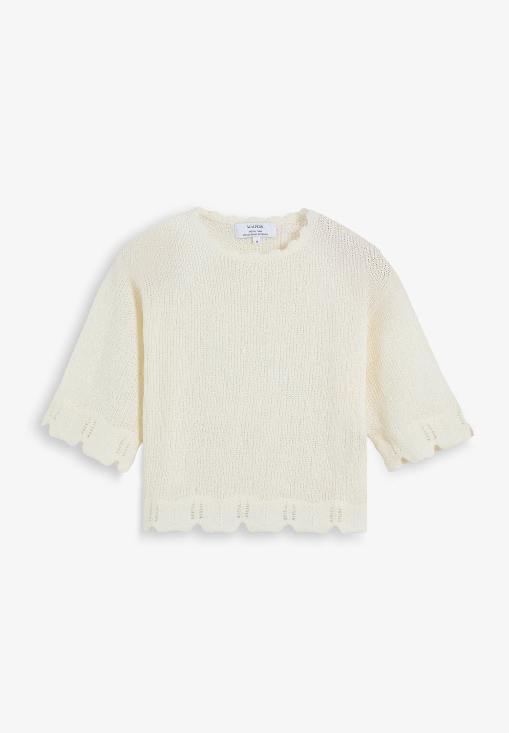 Sweater made of 100% cotton. Cropped, regular fit. Round neck and short sleeves. Openwork detail and wavy detailing on sleeves and hem.