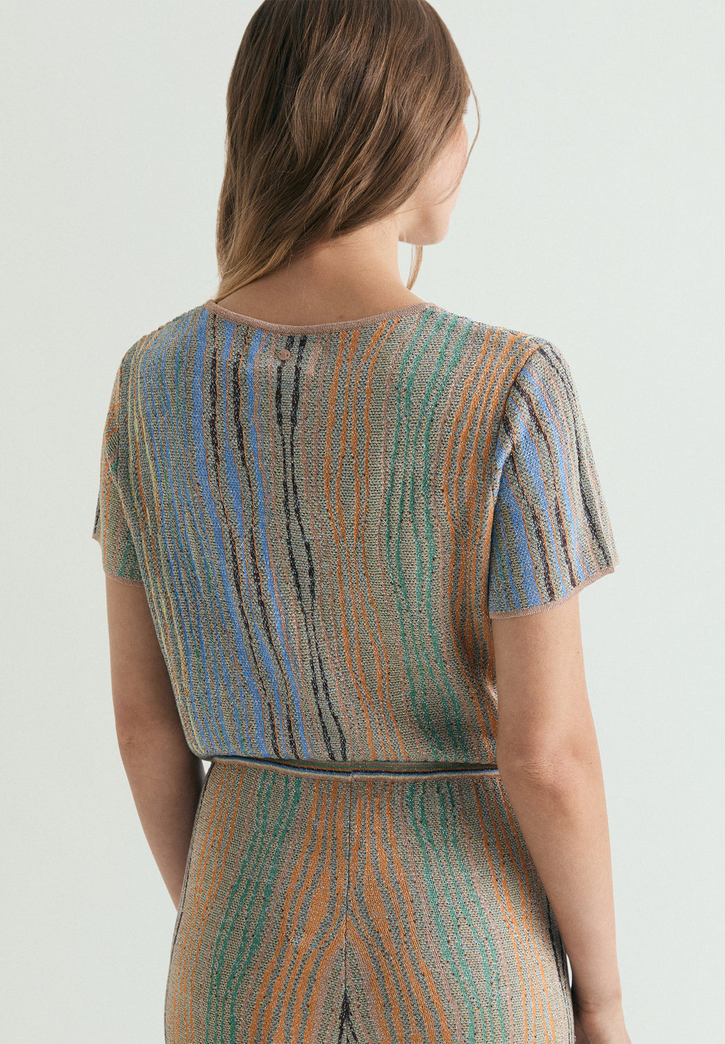 Top made of metallic thread. Round neck and asymmetric cut-out at the chest. Short sleeve. Multicoloured print.