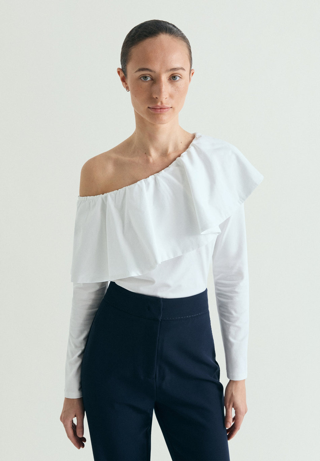 Top made of a cotton blend. Asymmetric neckline with ruffle and long sleeves.