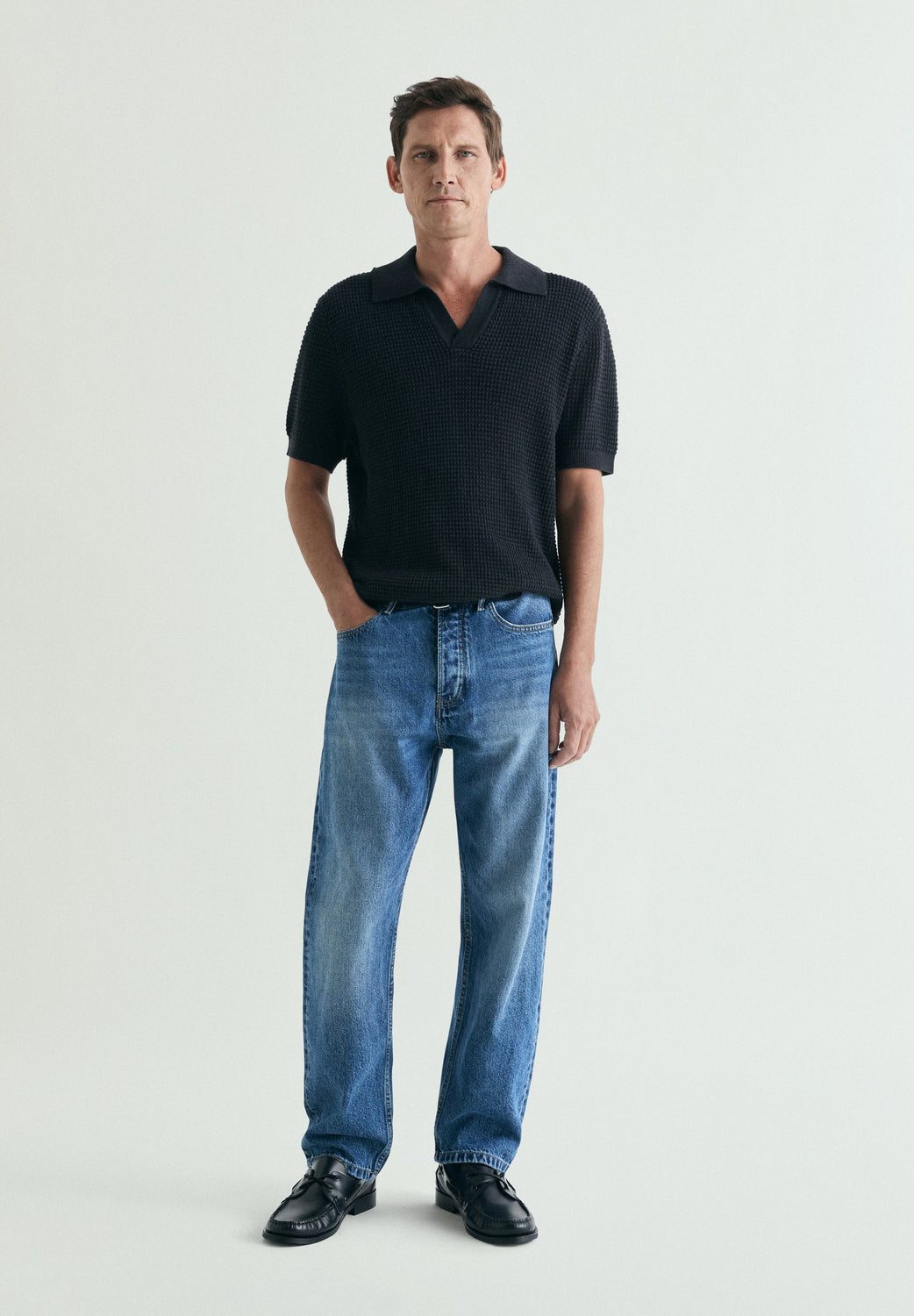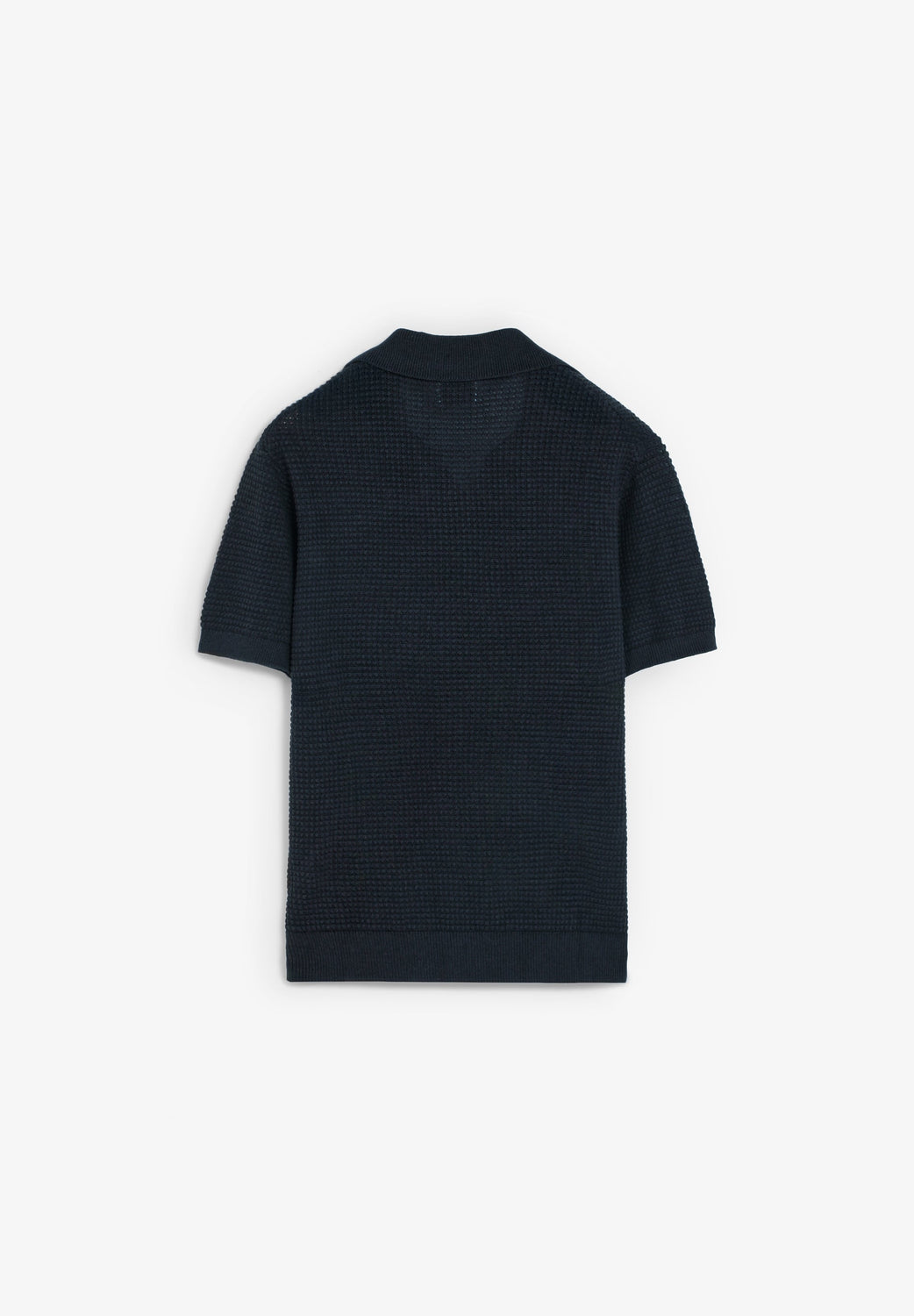 Polo shirt made of crochet fabric. Open V-neck and short sleeves.