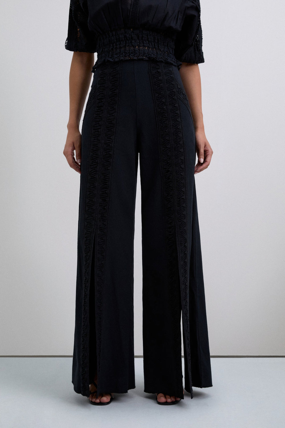Pantalón confeccionado en 100% algodón con detalles de aberturas y bordados. Corte full length, regular fit.