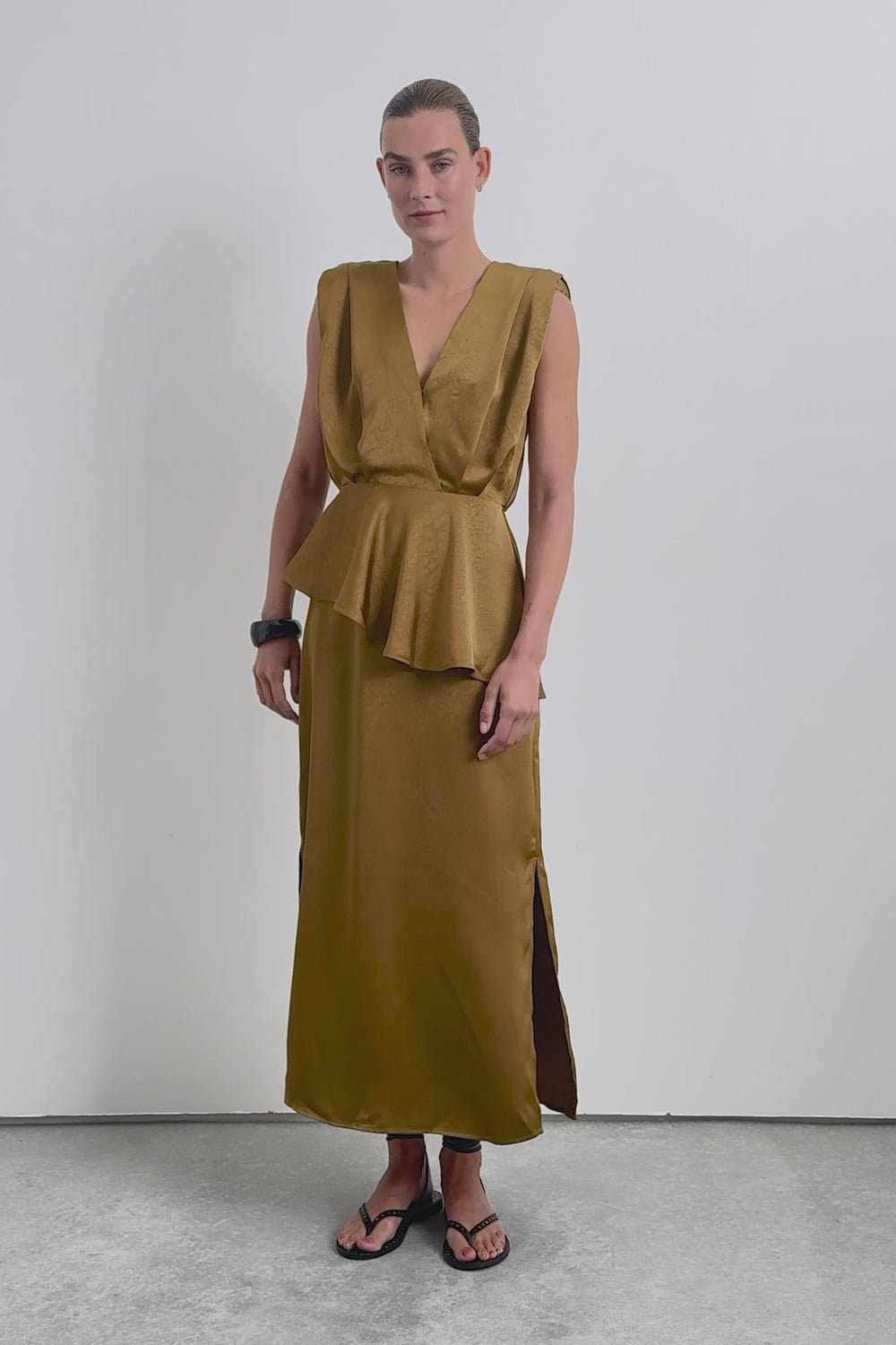 Top made of stretchy fabric with texture. Regular fit, V-neck, sleeveless design with slightly padded shoulders. Pleated at the bust, gathered waist and ruffle on the hem.