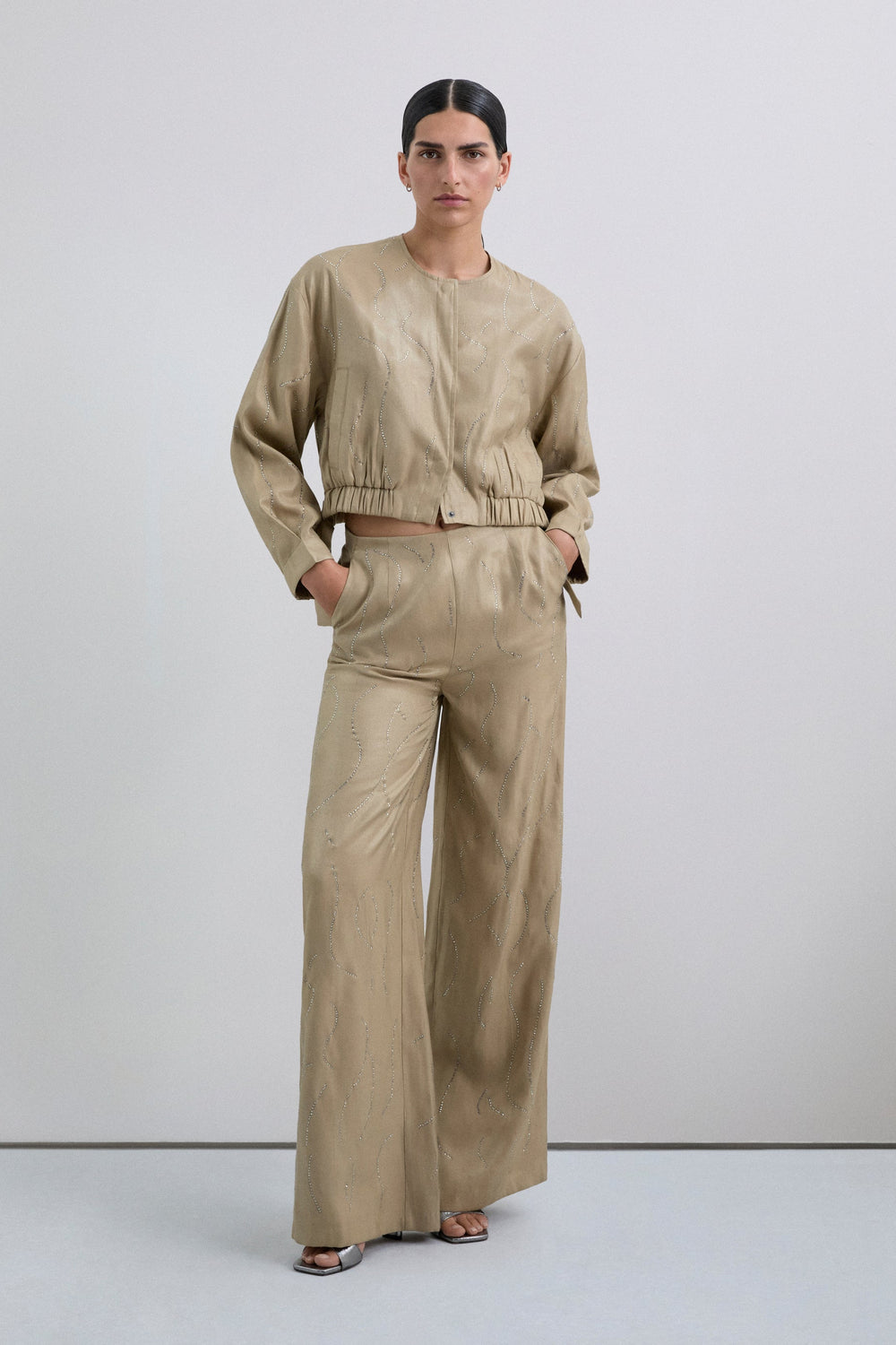 Bomber jacket with rhinestone detailing. Front zip and button fastening. Round neck. Gathered cuffs and hem. Flowing fabric with satin finish. Elasticated waistband with side tie details.