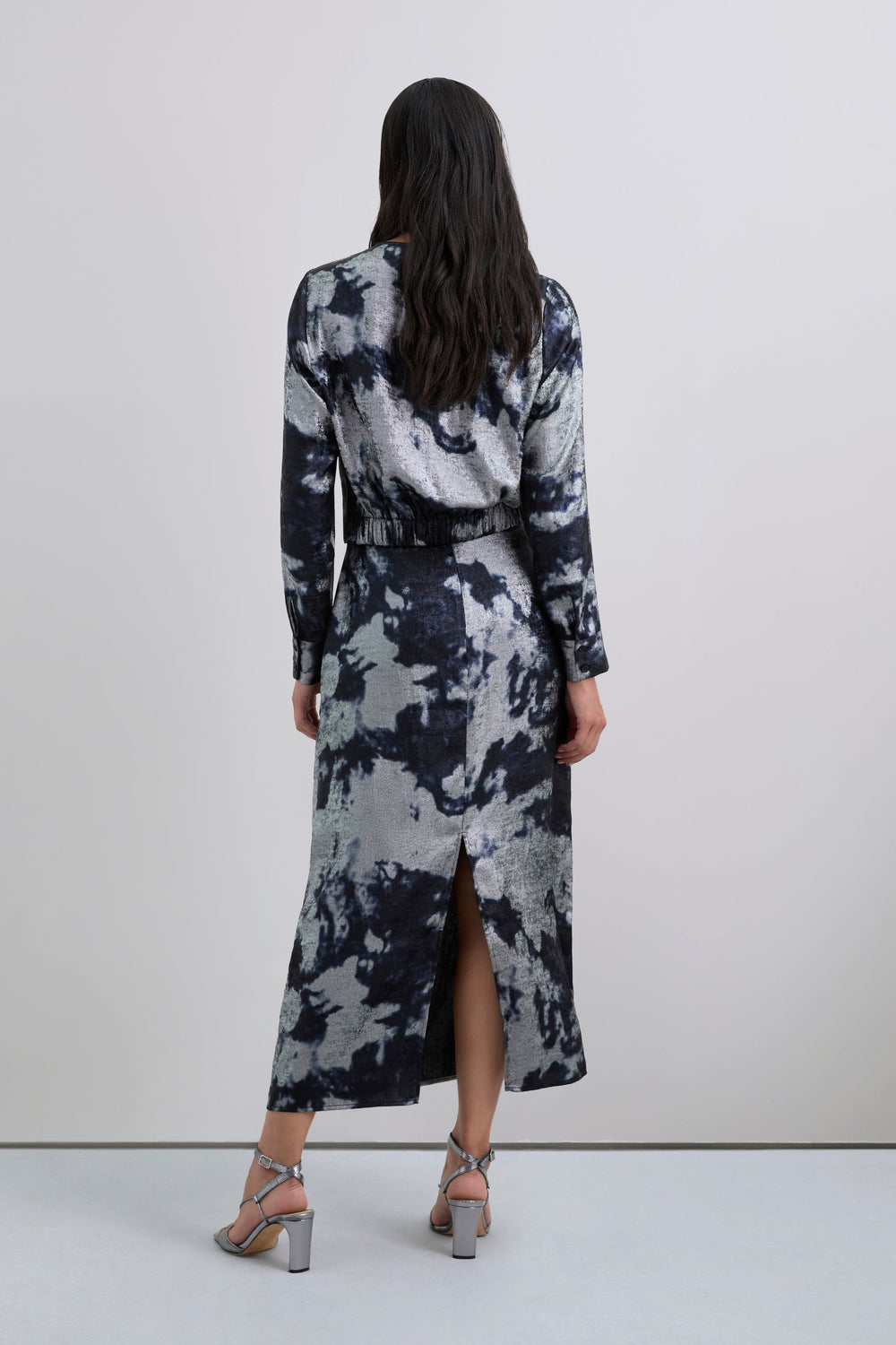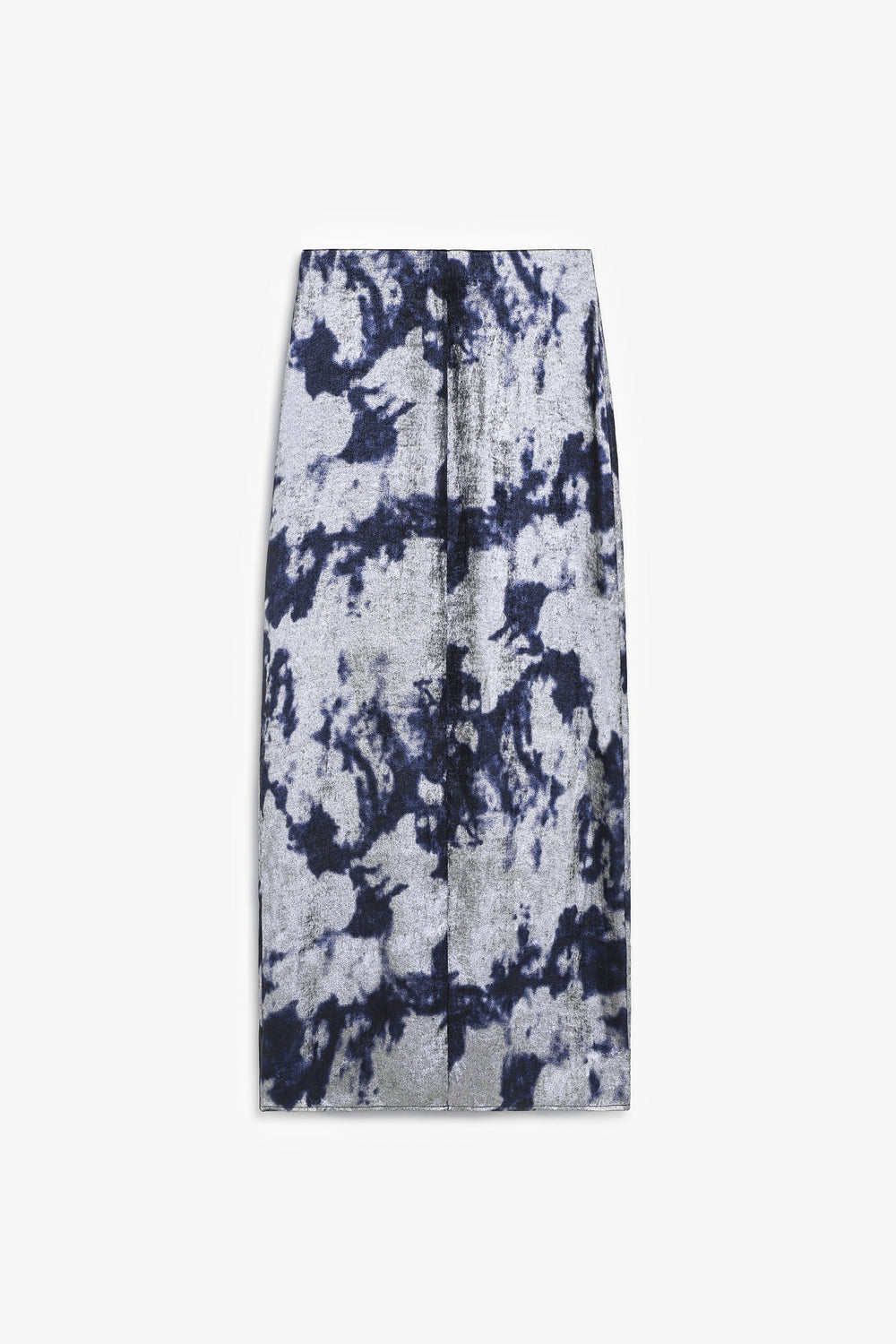 Flowing fabric skirt with tie-dye print and metallic details. Slim fit. Midi. Back vent. Concealed side zip fastening.