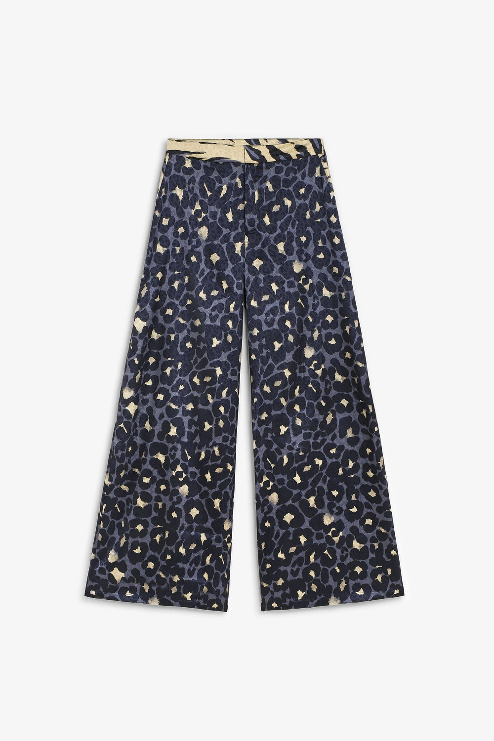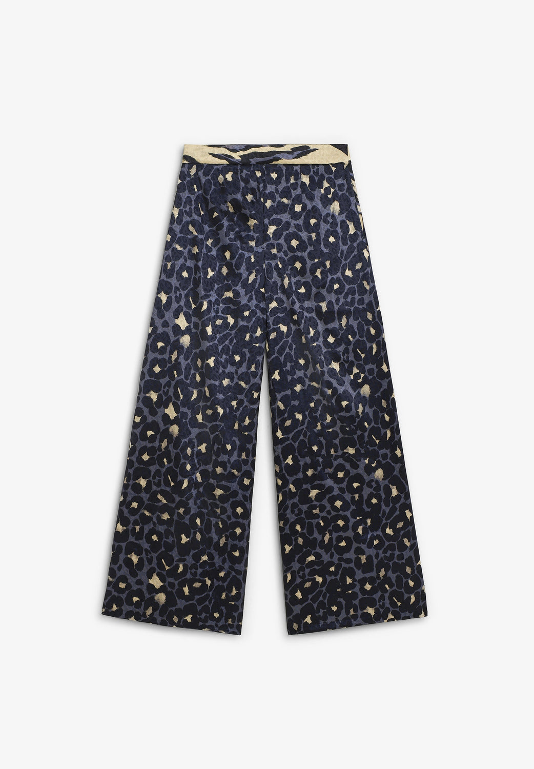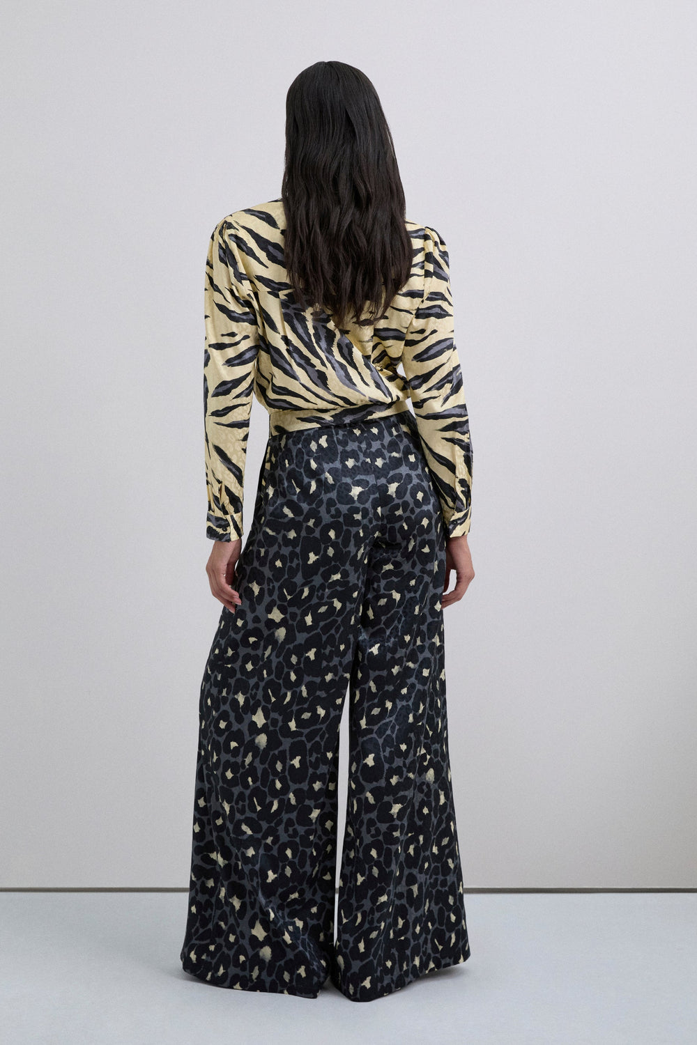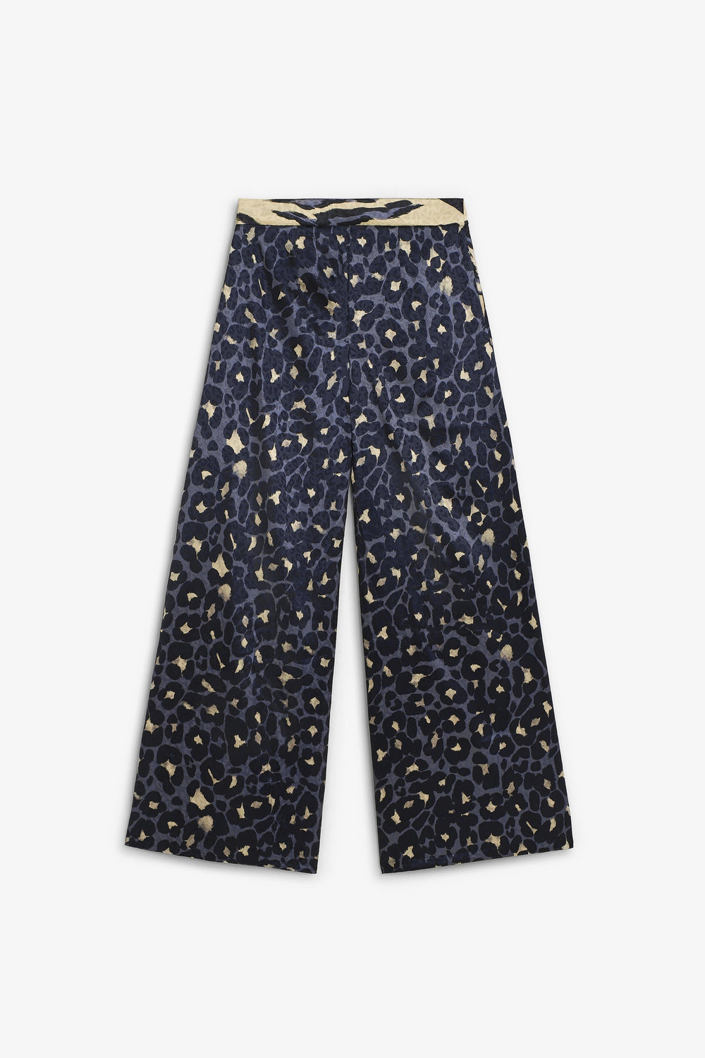 Pantalón fluido. Cierre de cremallera oculto por una tapeta con corchete y botón. Cintura elástica. Dos bolsillos laterales. Estampado animal print. Tejido fluido con acabado satinado.