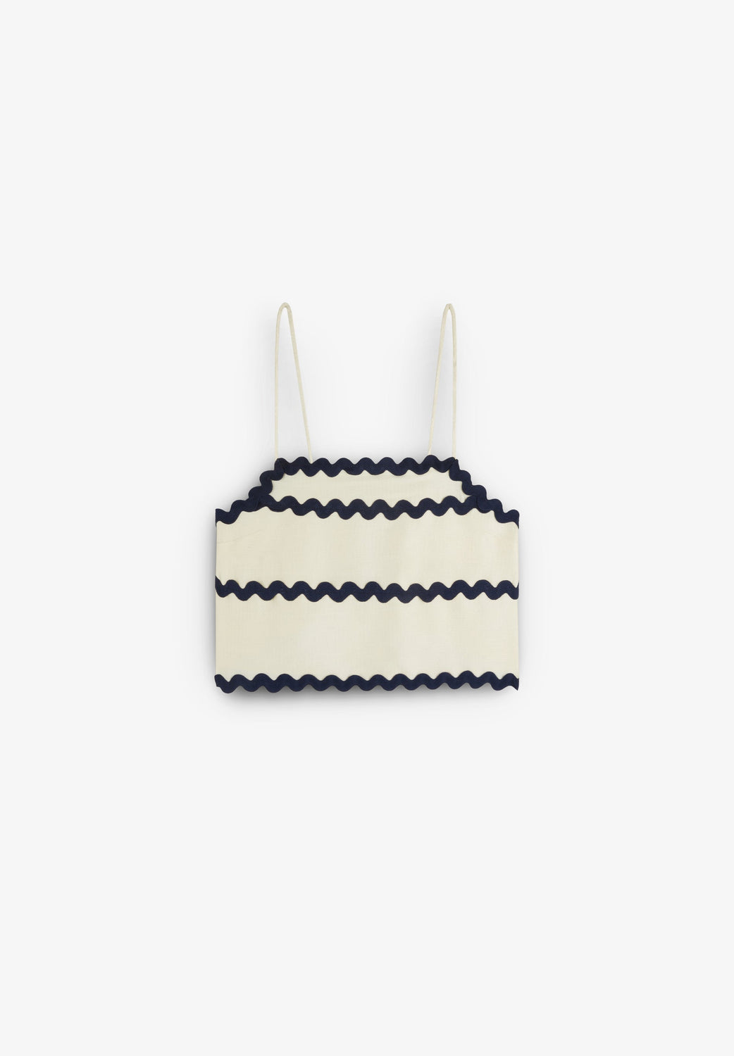 Top with thin straps and straight neckline. Contrast scalloped detail on pocket. Cropped.