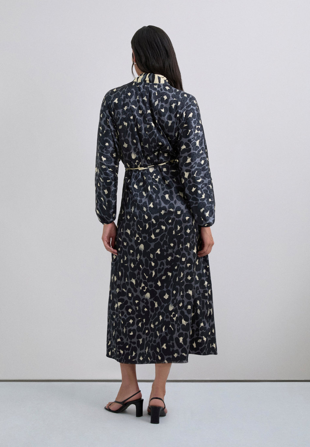 Vestido largo con estampado animal print. Manga larga ligeramente abullonada y terminada en frunce. Ajuste frontal mediante lazo. Escote en V.