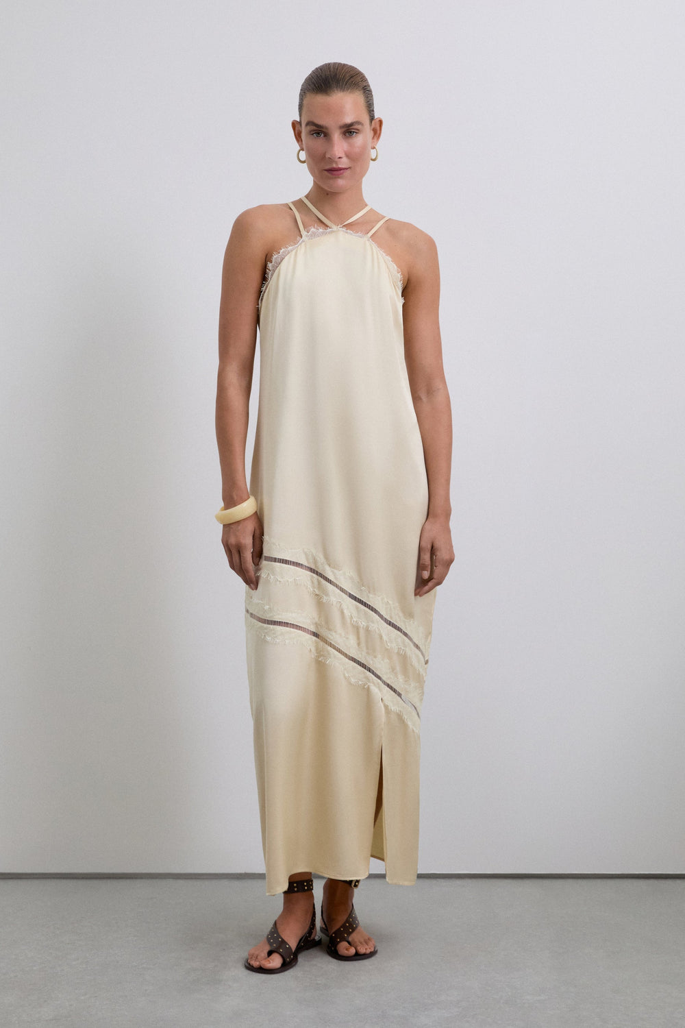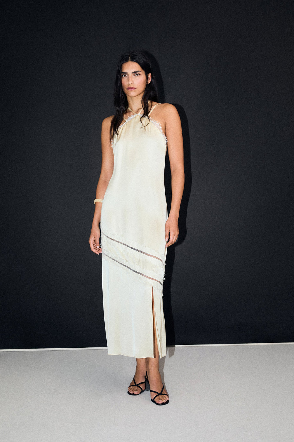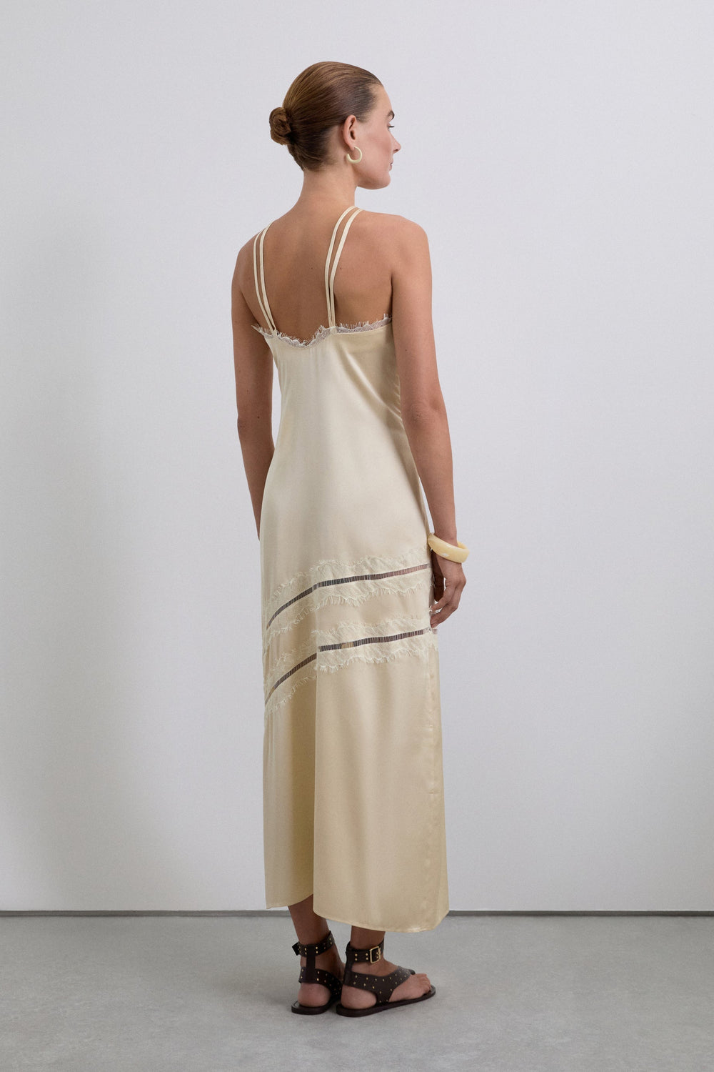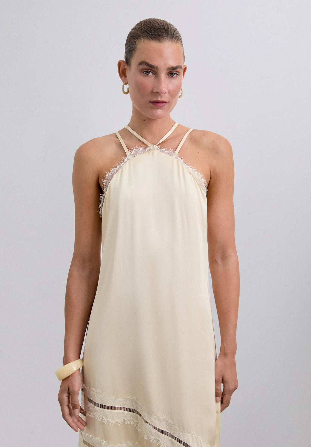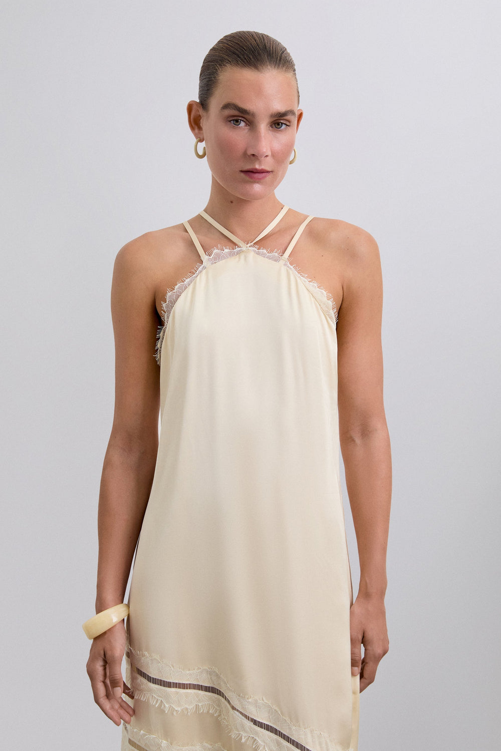 Flowing fabric midi dress with satin finish. Thin straps. Lace detail on the neckline. Asymmetric motifs. Slit on hem.