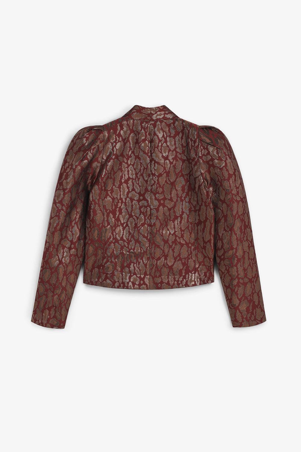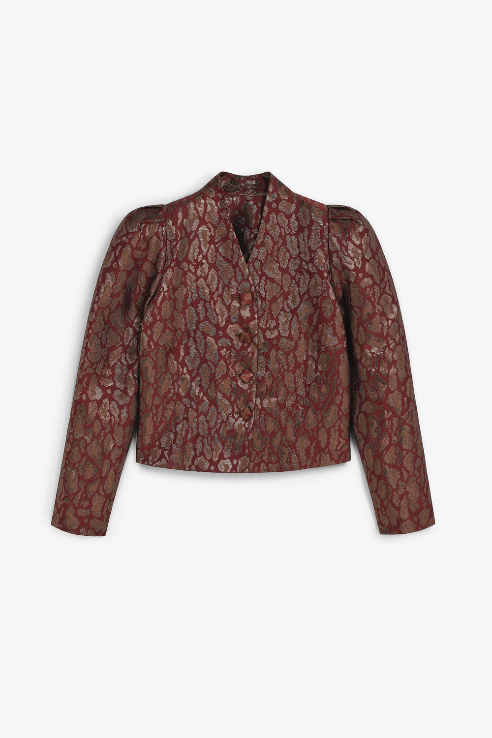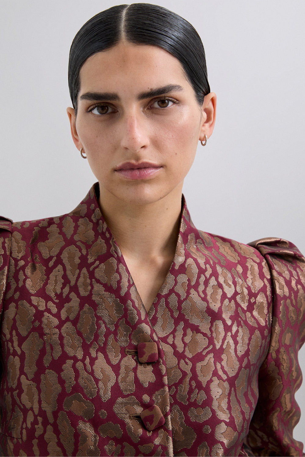 Cropped blazer in metallic-effect fabric with animal print. Slightly high collar. Long balloon sleeves with pleating at the shoulders. Fitted design with button fastening.