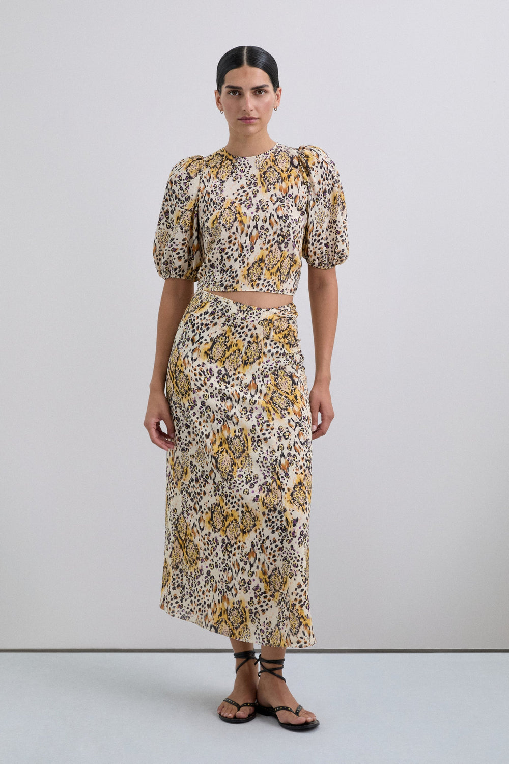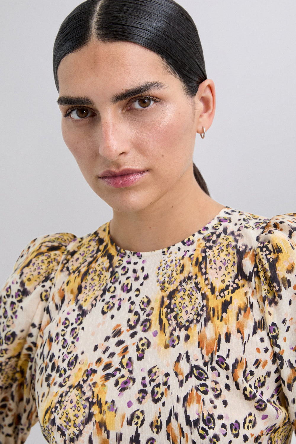 Animal print top. Round neck and short slightly puffed sleeves. Lace-up fastening at back.
