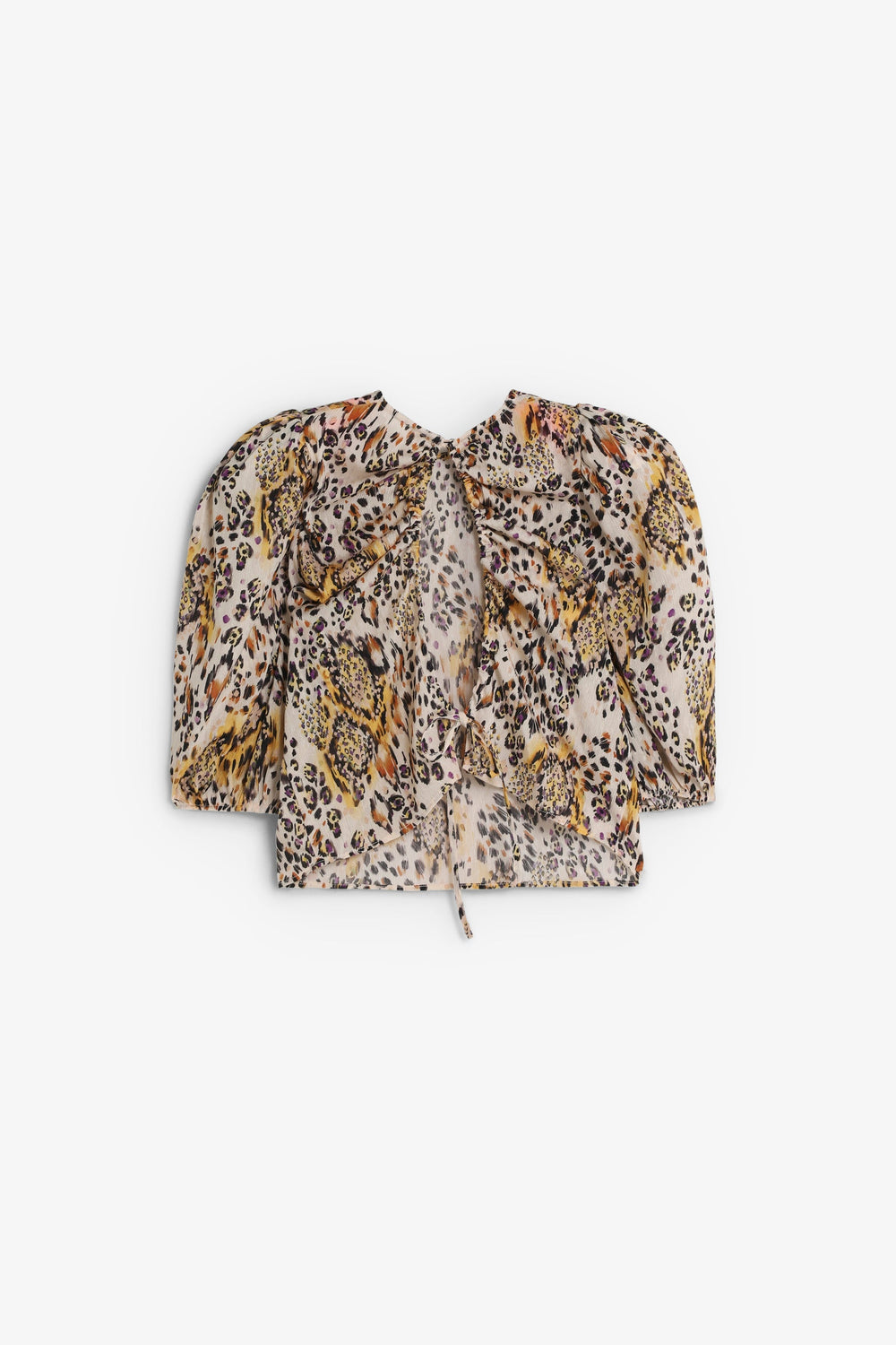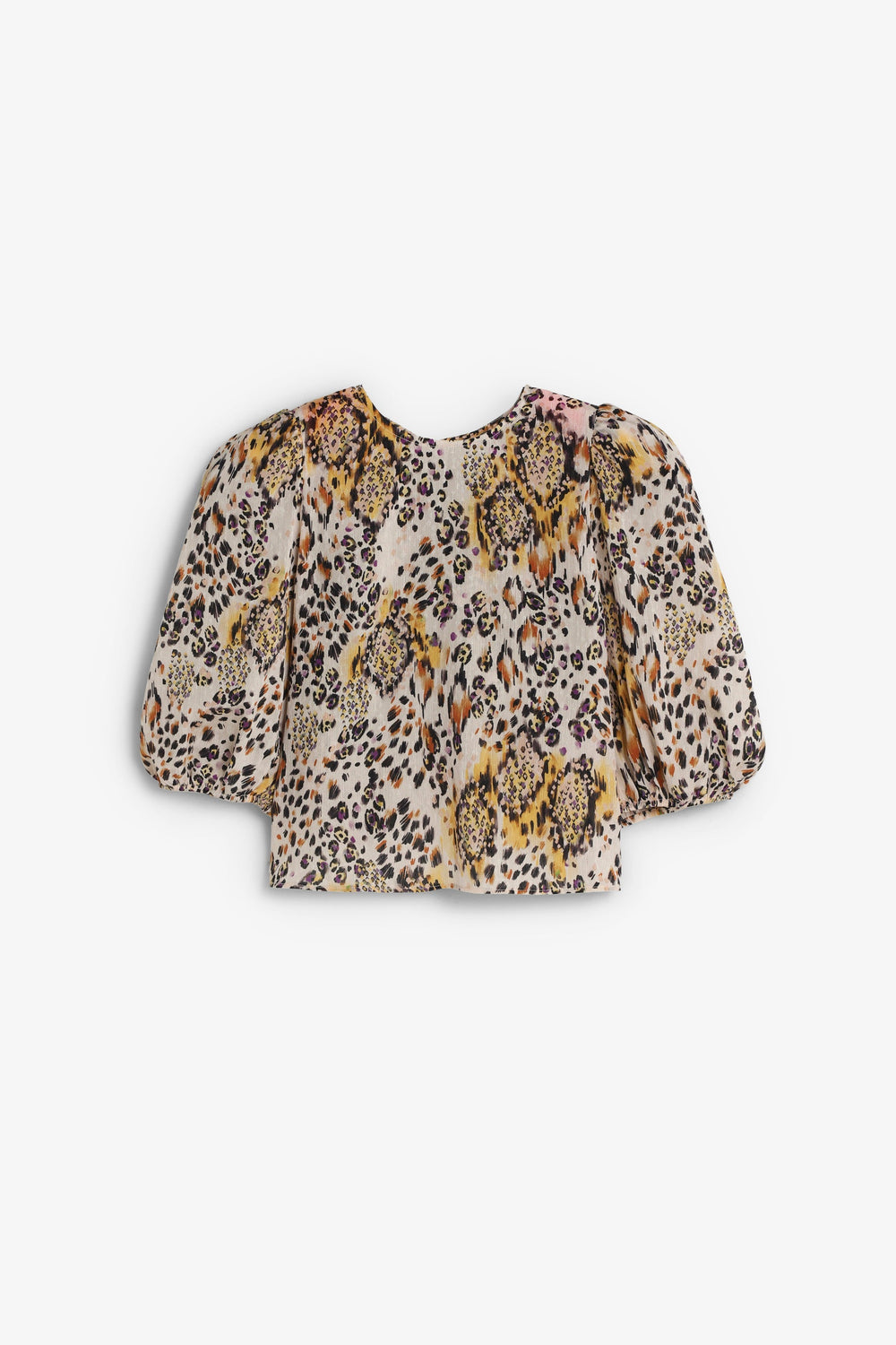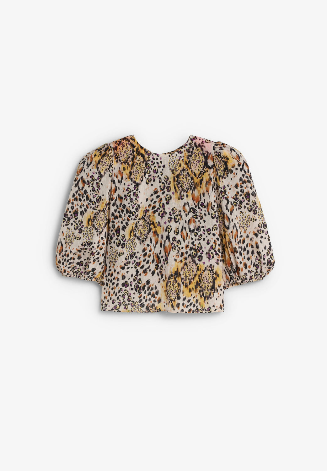 Top animal print. Cuello redondo y manga corta ligeramente abullonada. Espalda con cierre lazo.