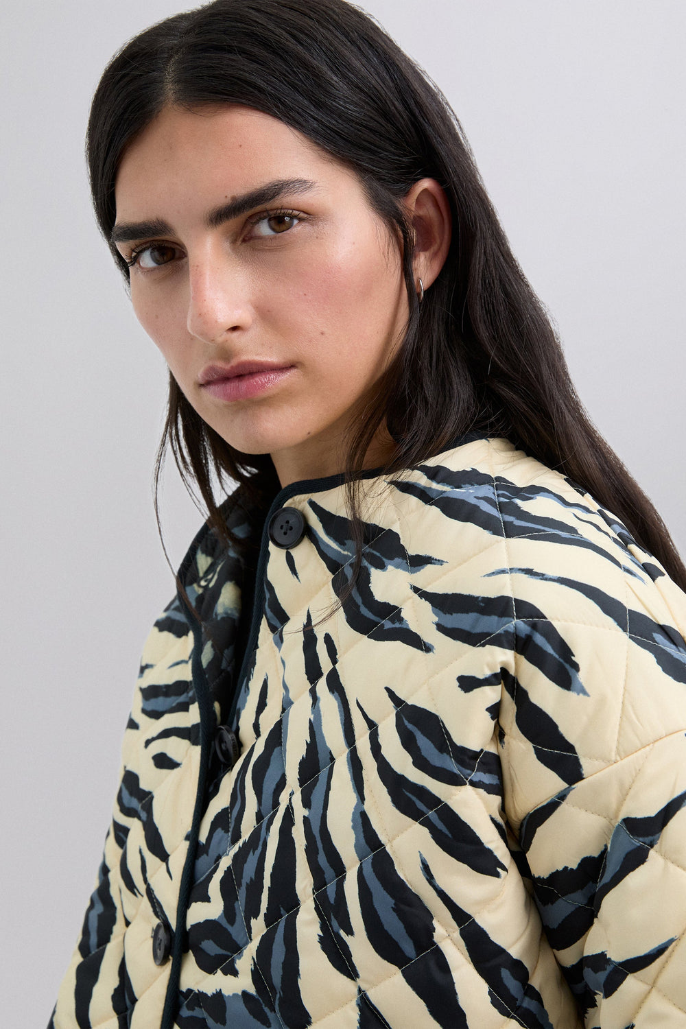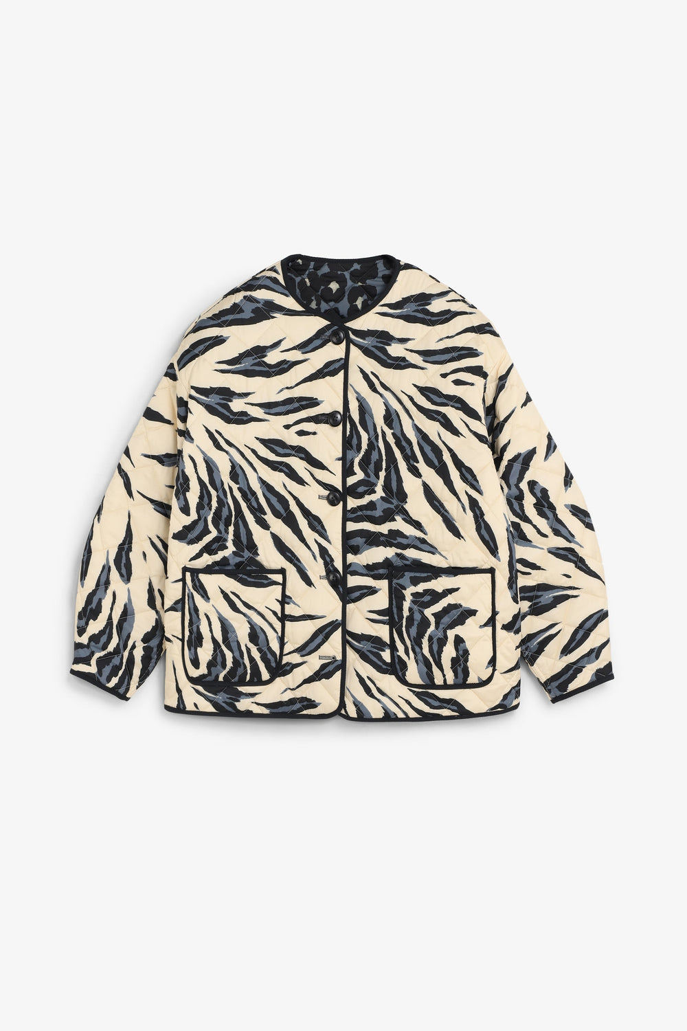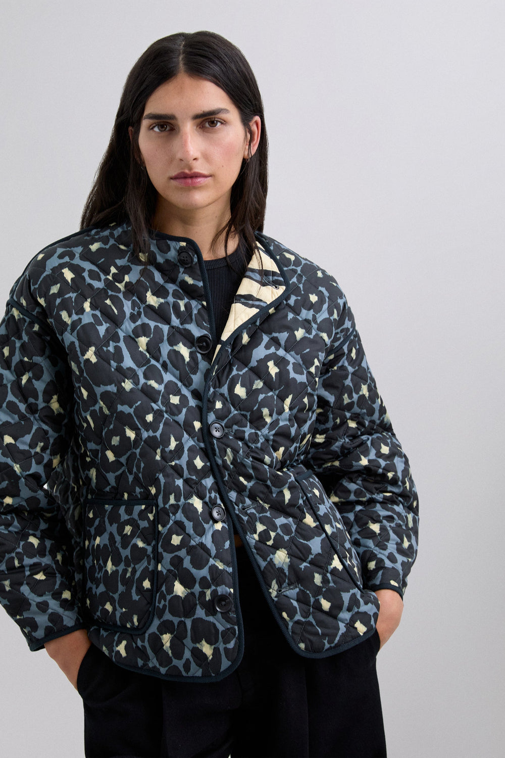 Reversible puffer jacket. Animal print. Long sleeves. Two front pockets. Button fastening.