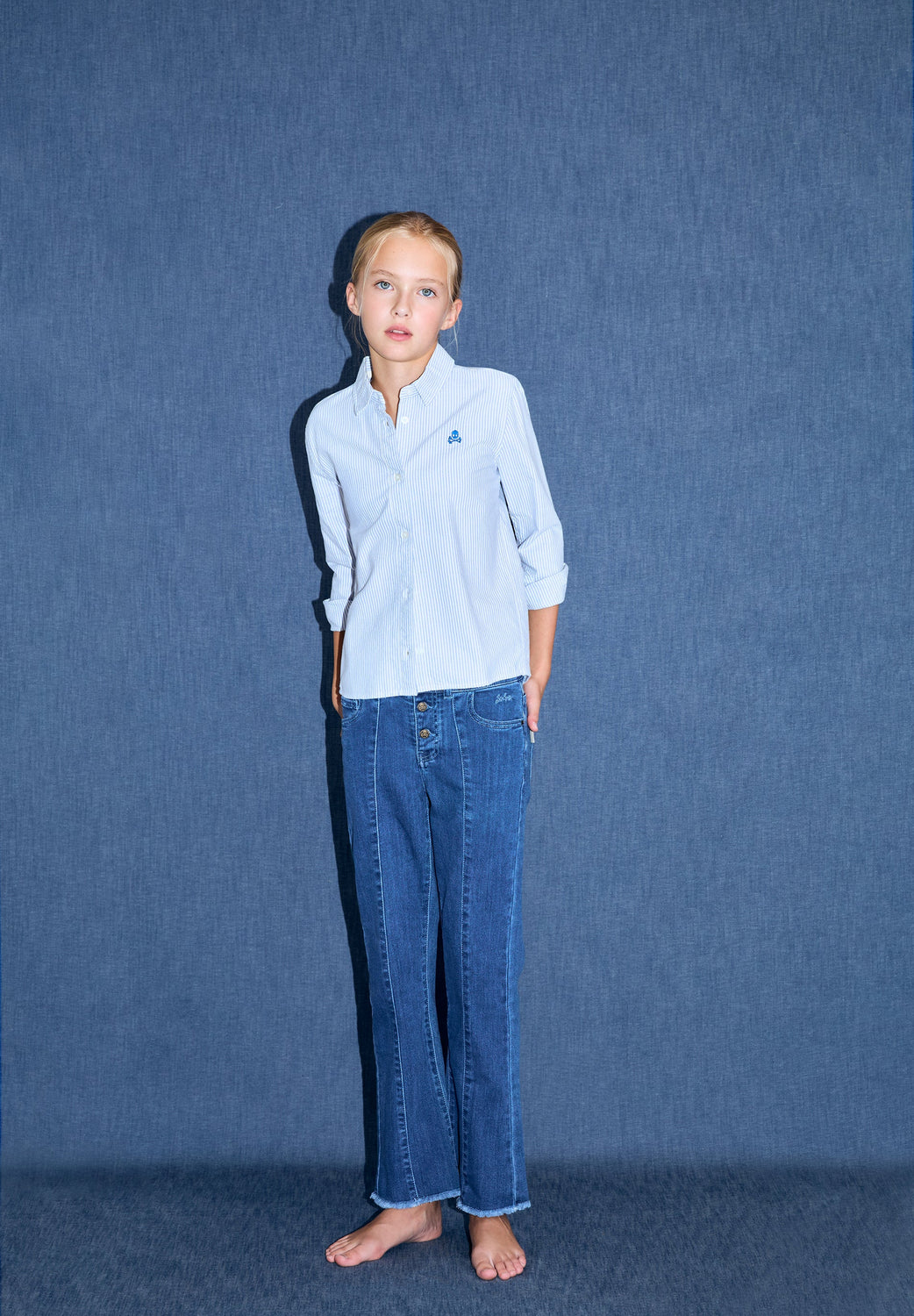Trousers made of slightly stretchy cotton. Flared. Button fastening with skull logo details. Front pockets and back patch pockets Finished with fringing and front stitching.