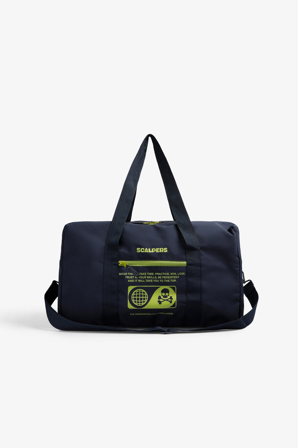 Bag made of a technical fabric. Main and side compartments with zip closure. Zip fastening, short handles and long detachable strap. Front logo and skull print.