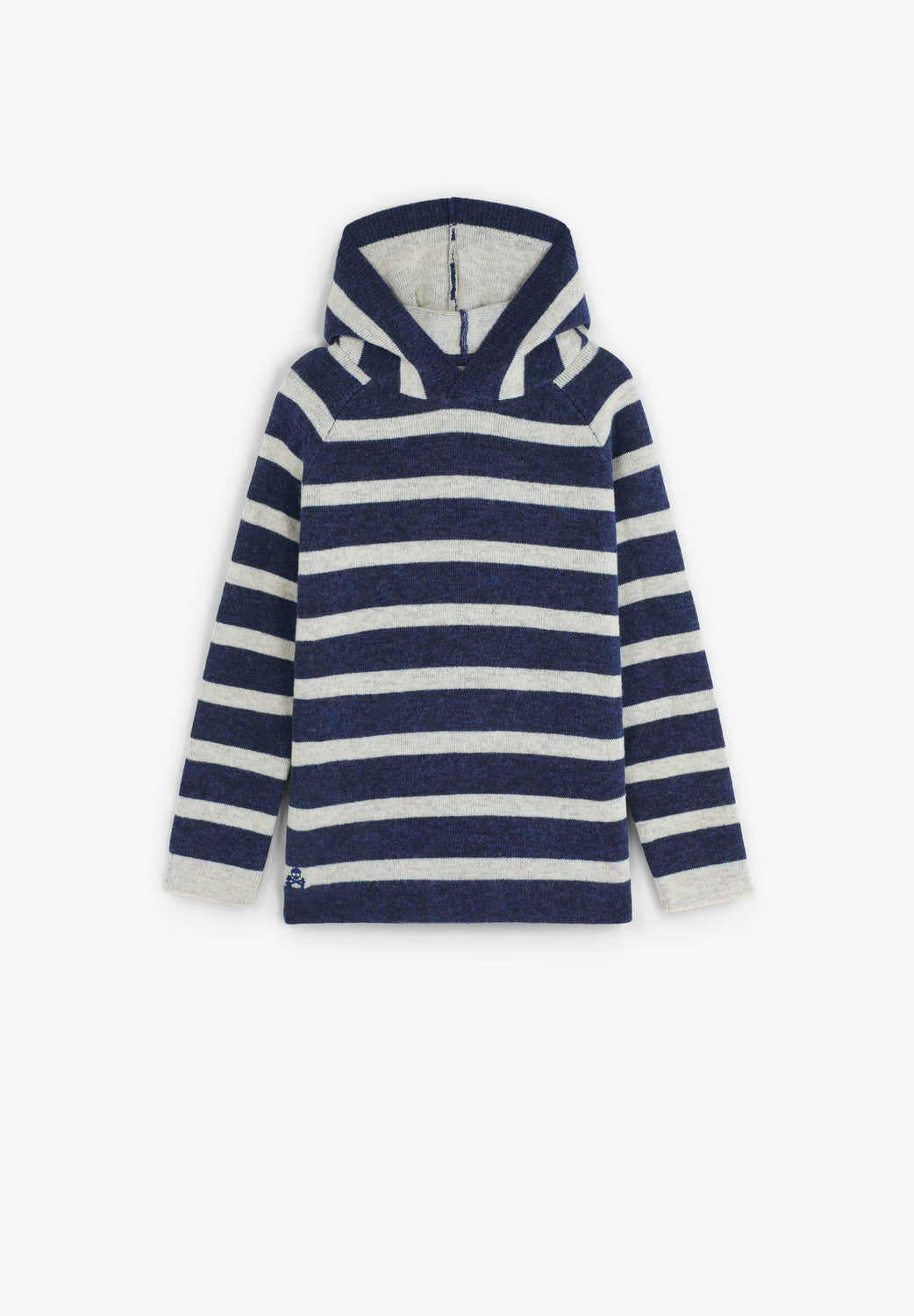 Hooded knit sweater made of a wool blend. Stripe print. Long sleeves. Contrast embroidered skull on the hem.