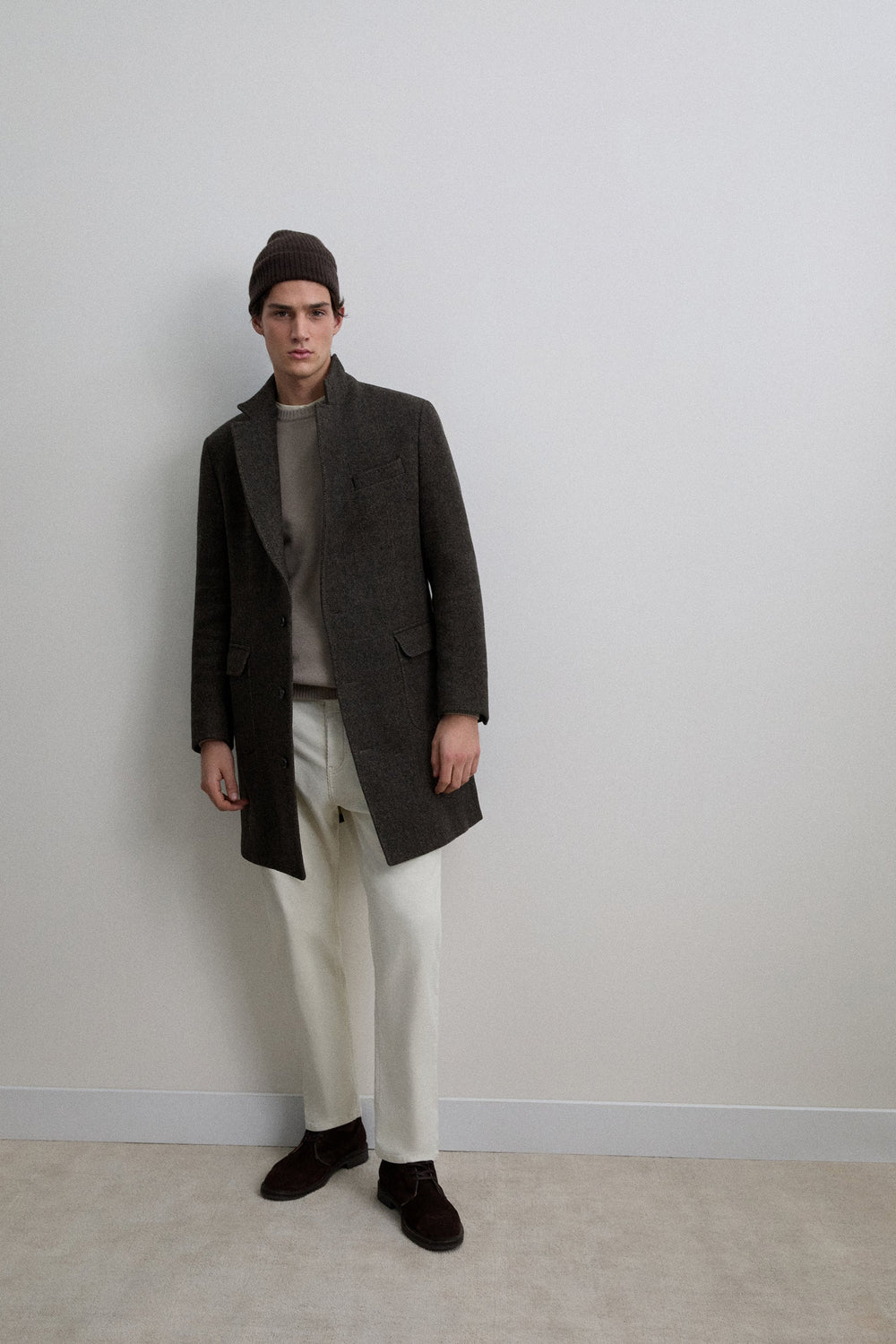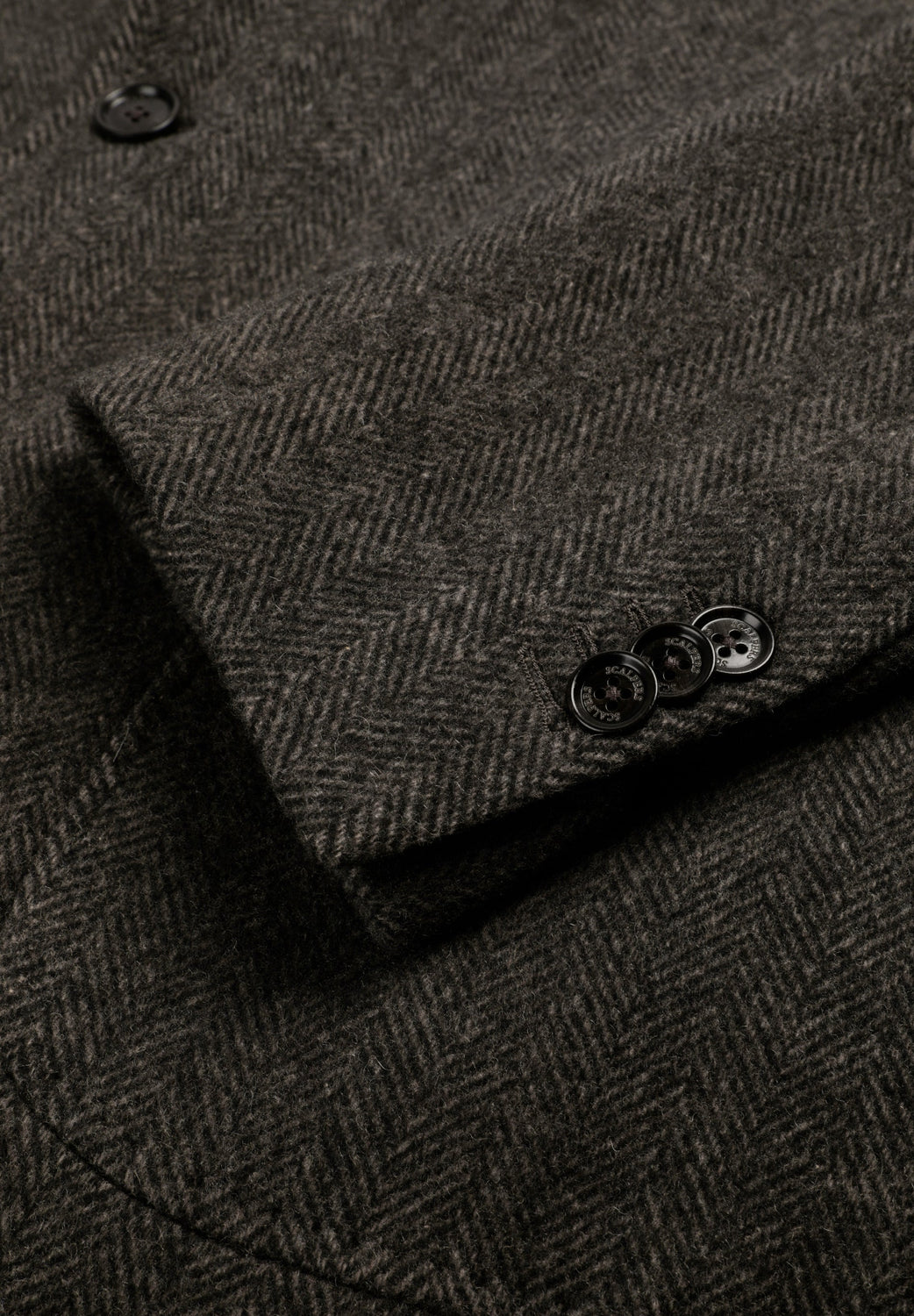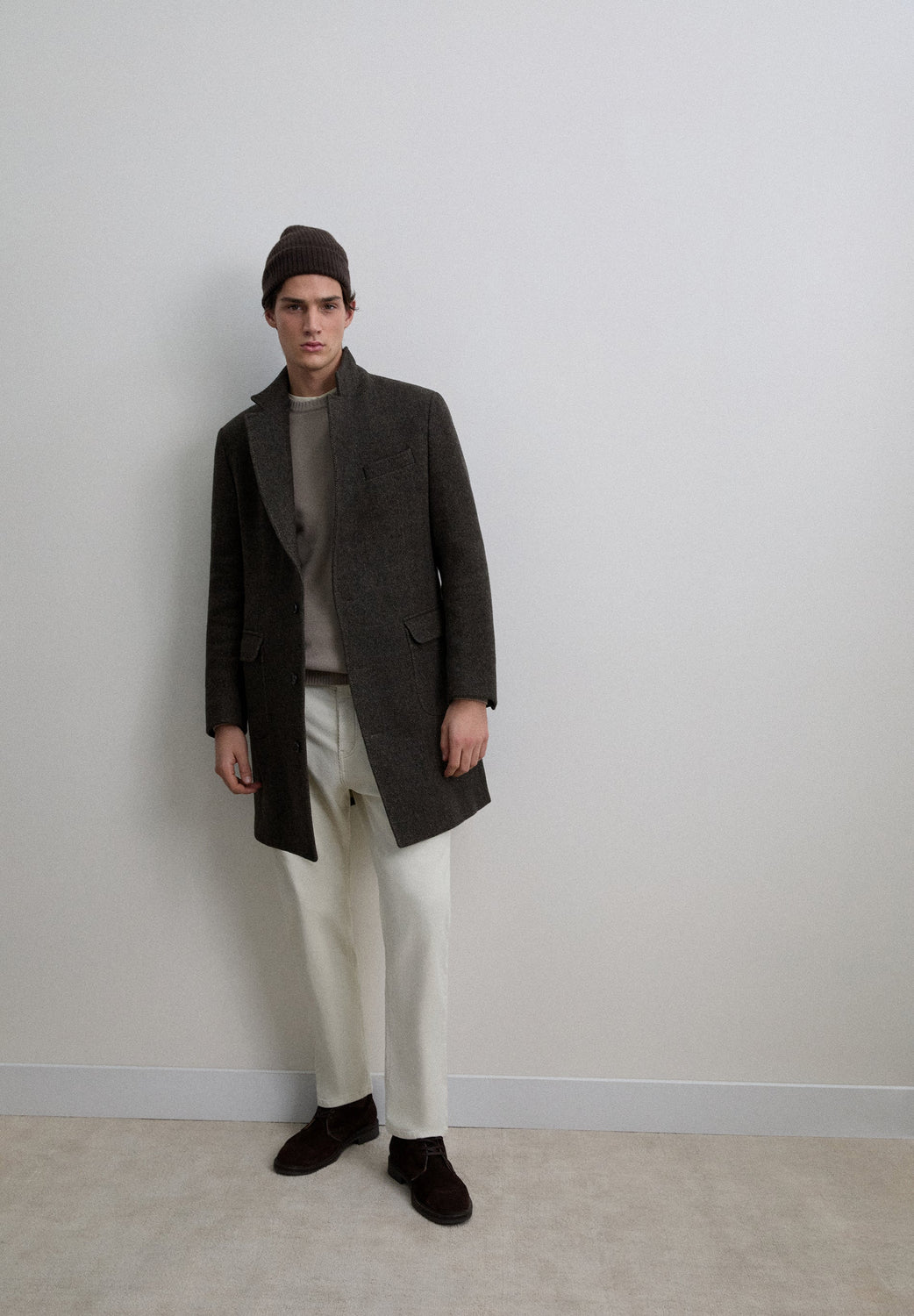 Herringbone woven coat in shades of brown. Lapel collar. Double flap pockets and front button fastening. Brushed feel.
