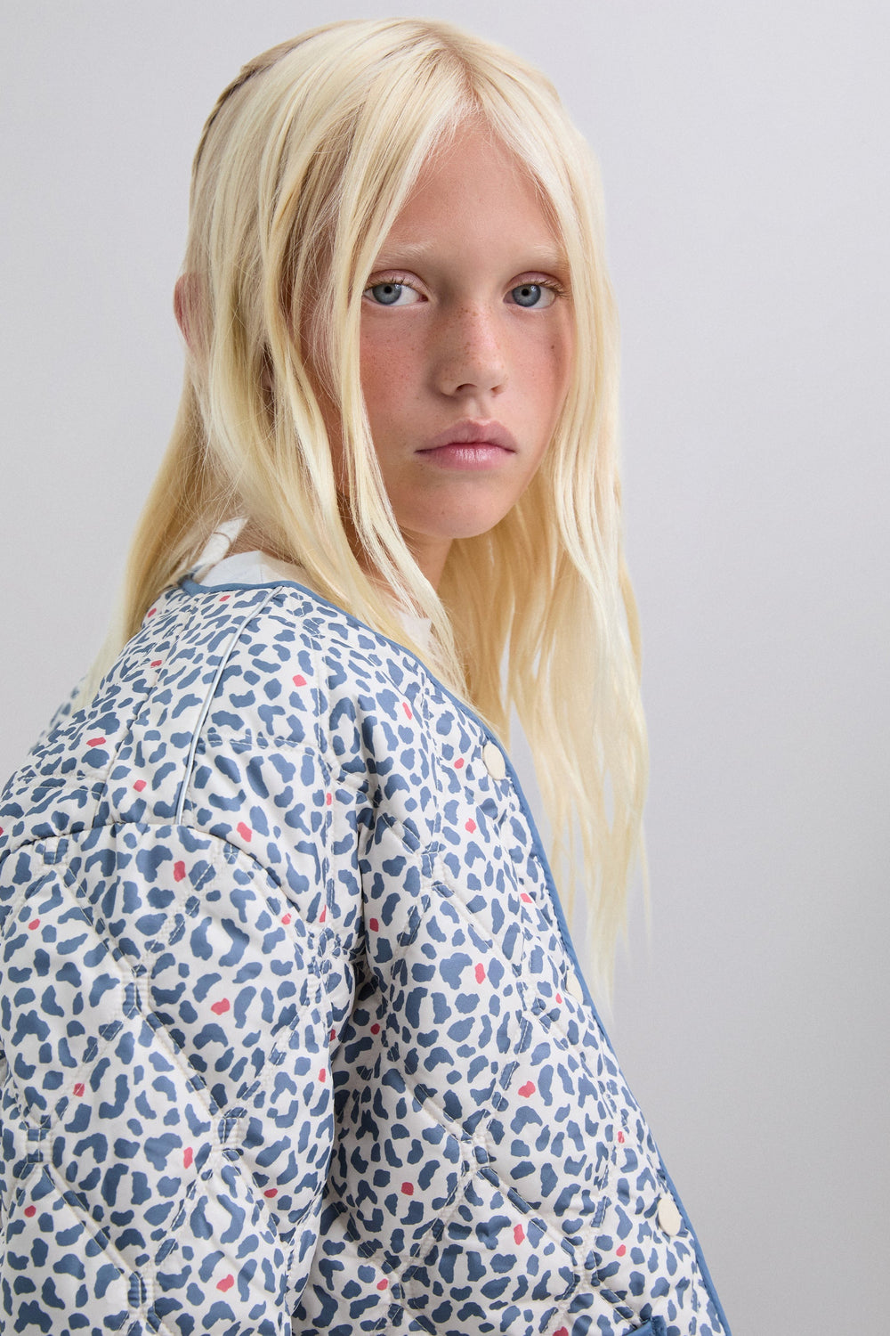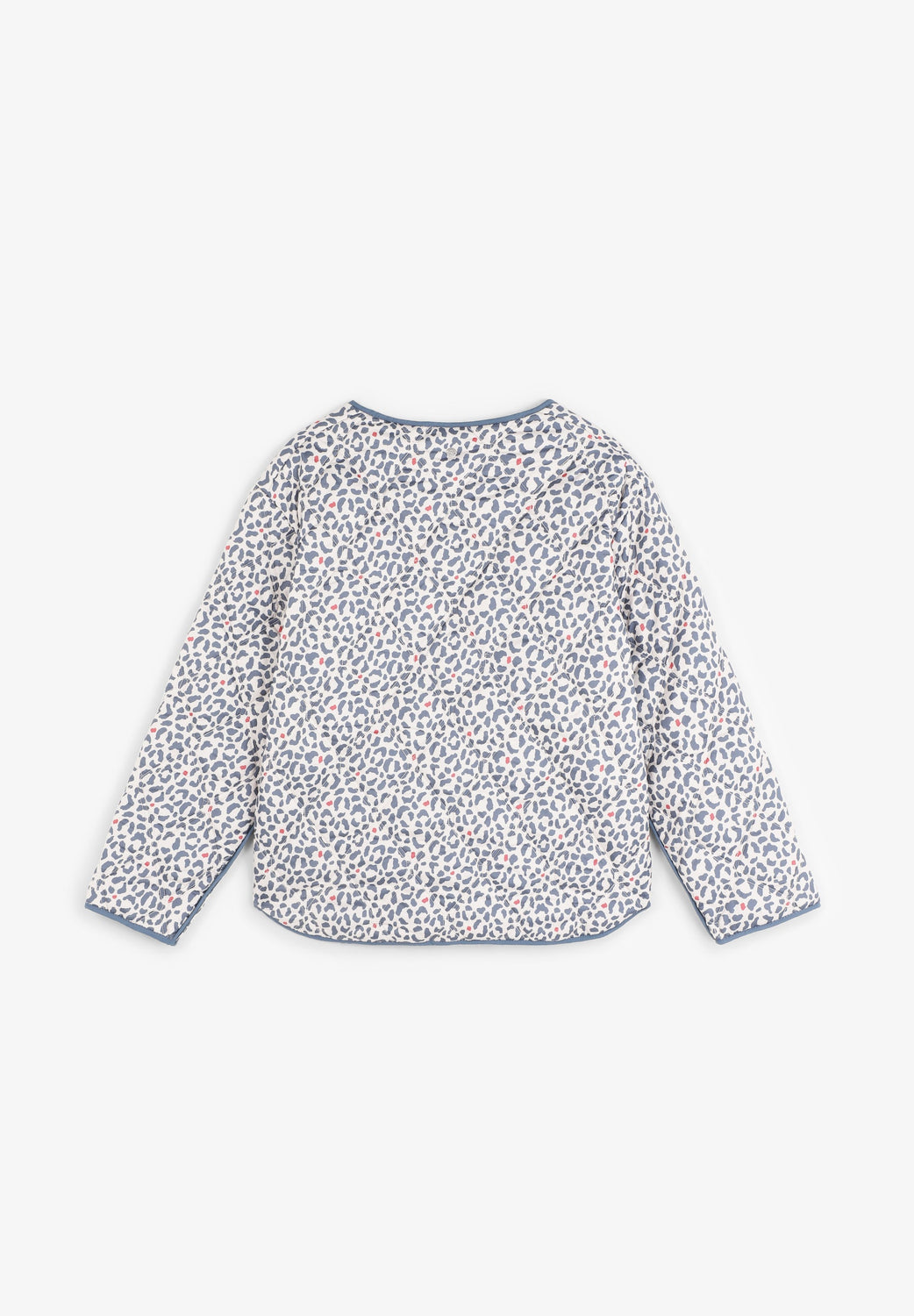 Puffer jacket made of a synthetic blend. Animal print. Button fastening. Slightly V-neck. Long sleeves. Two front pockets.