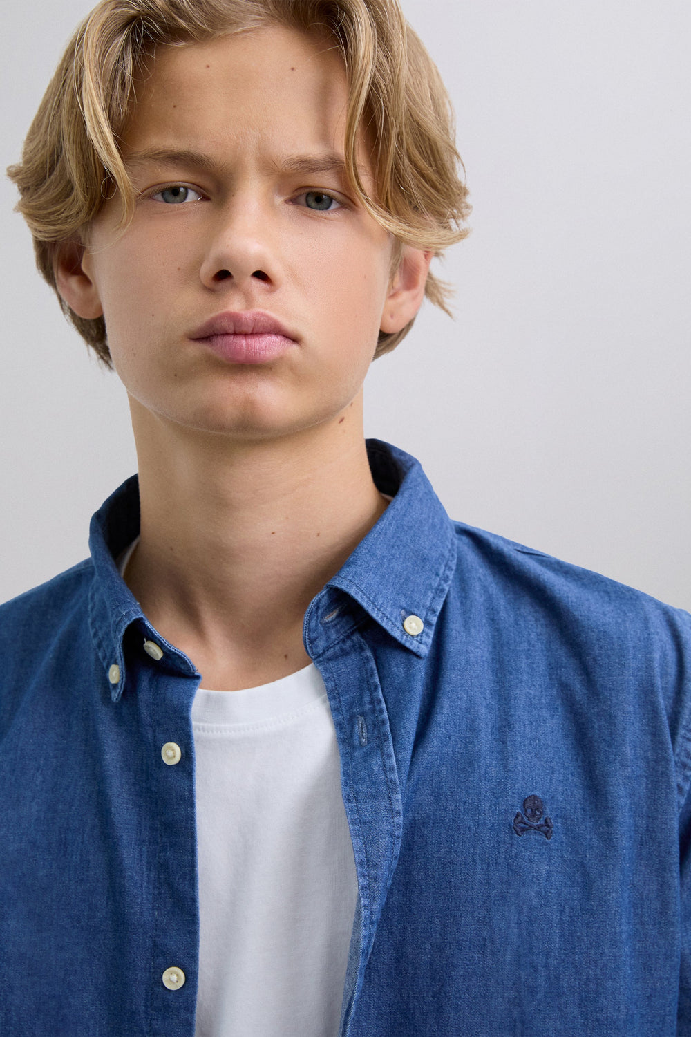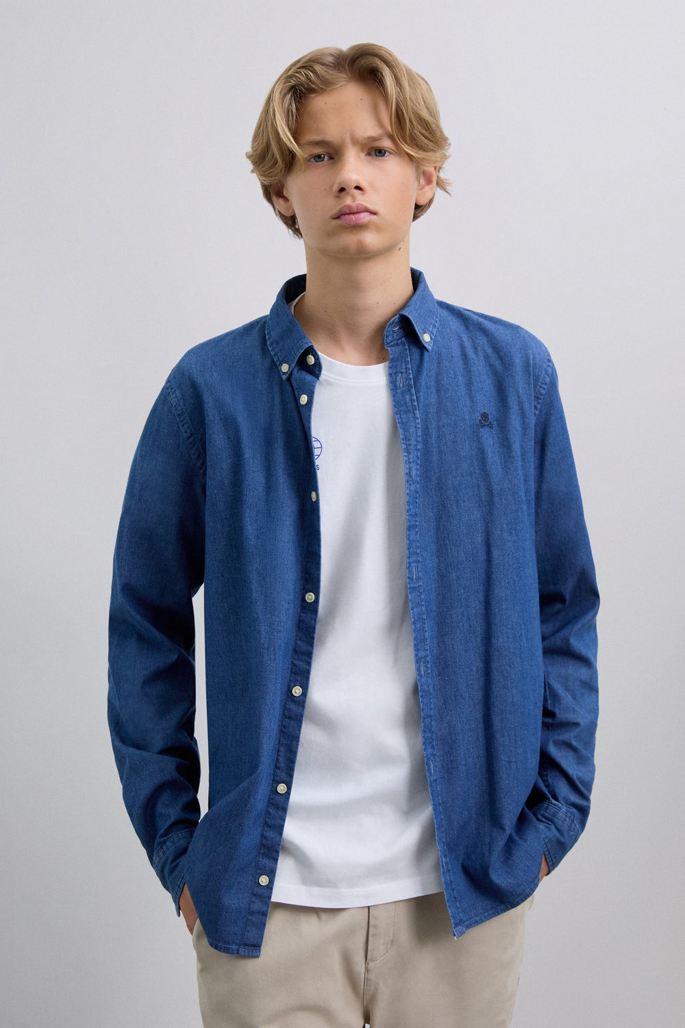 Oxford shirt made of BCI cotton. Denim. Regular Fit. Classic collar and button fastening. Long sleeves with buttoned cuffs. Embroidered contrast skull on the chest.