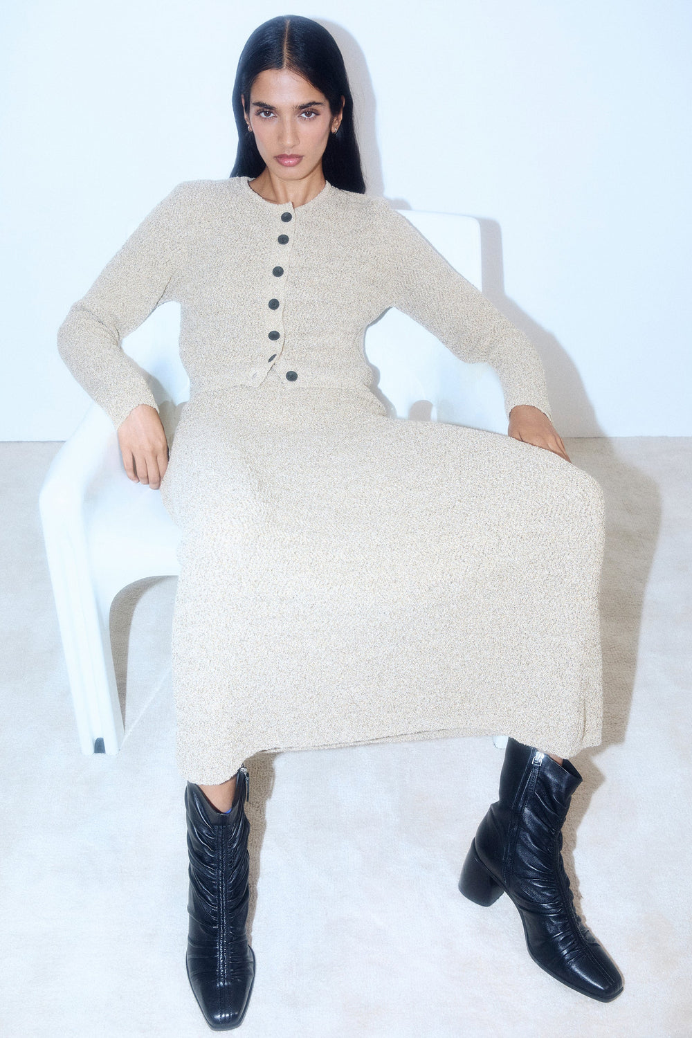 Long skirt made of knitted fabric. Flared. Elasticated waistband.