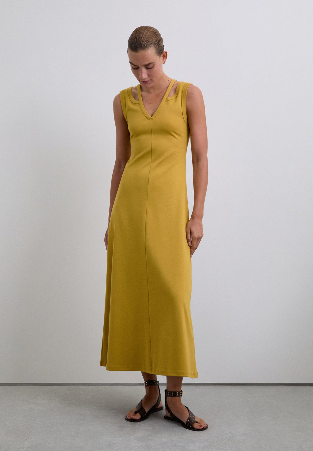 Midi dress made of 100% organic BCI cotton. Sleeveless. V-neck with cut-out details and double straps.