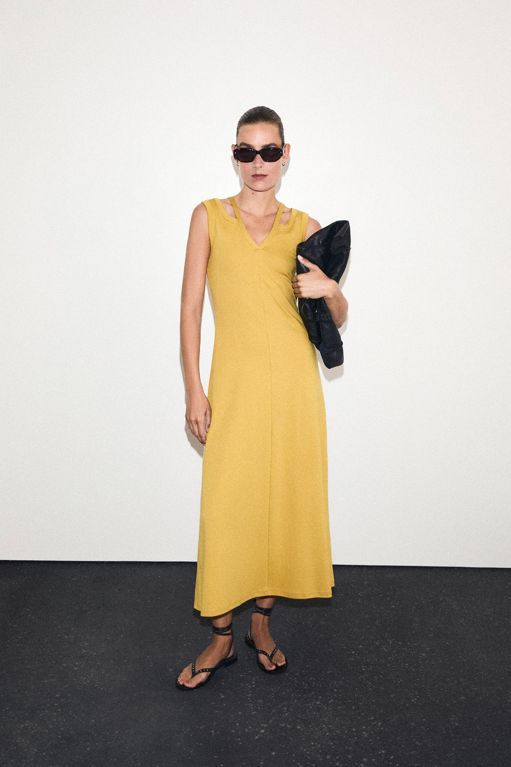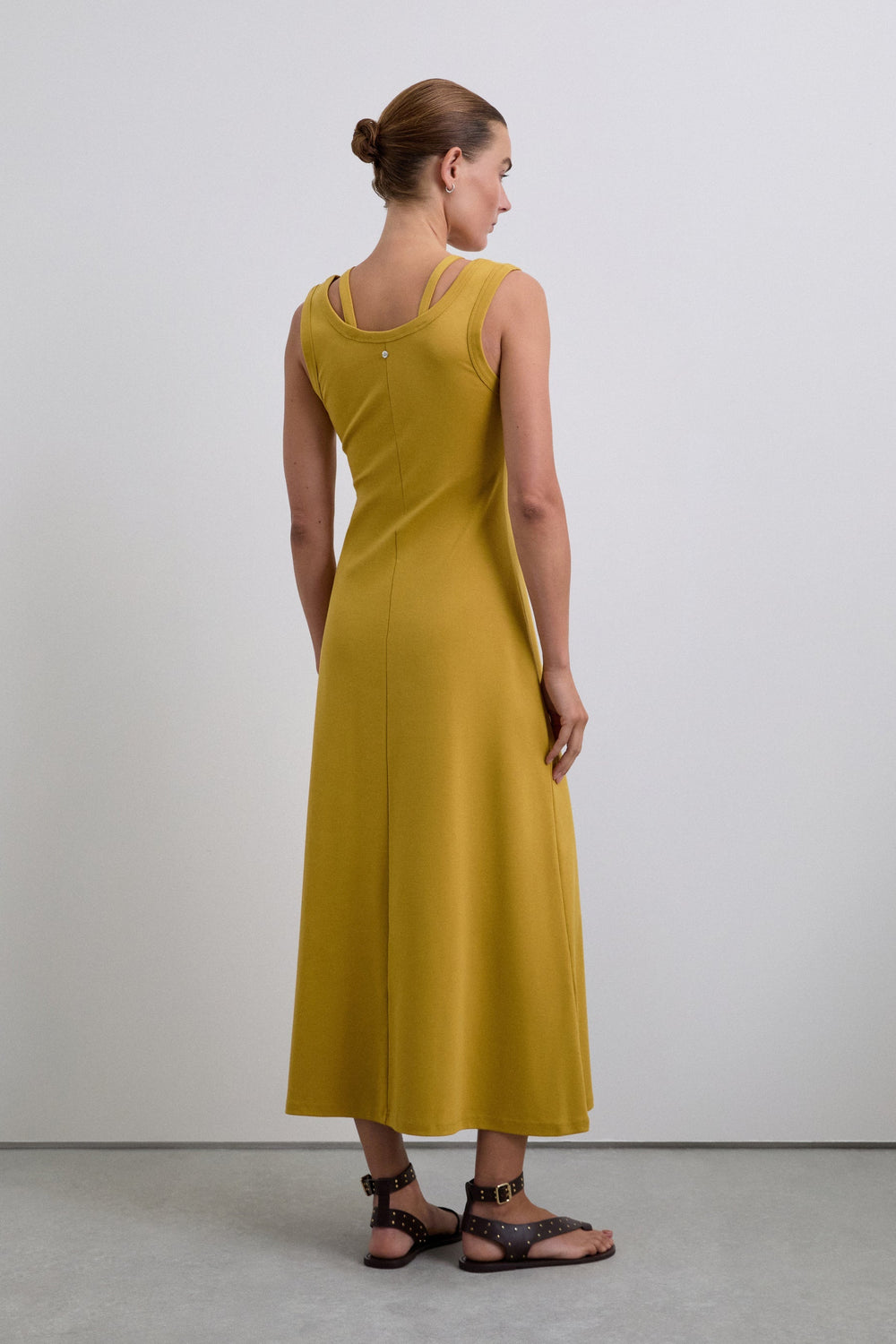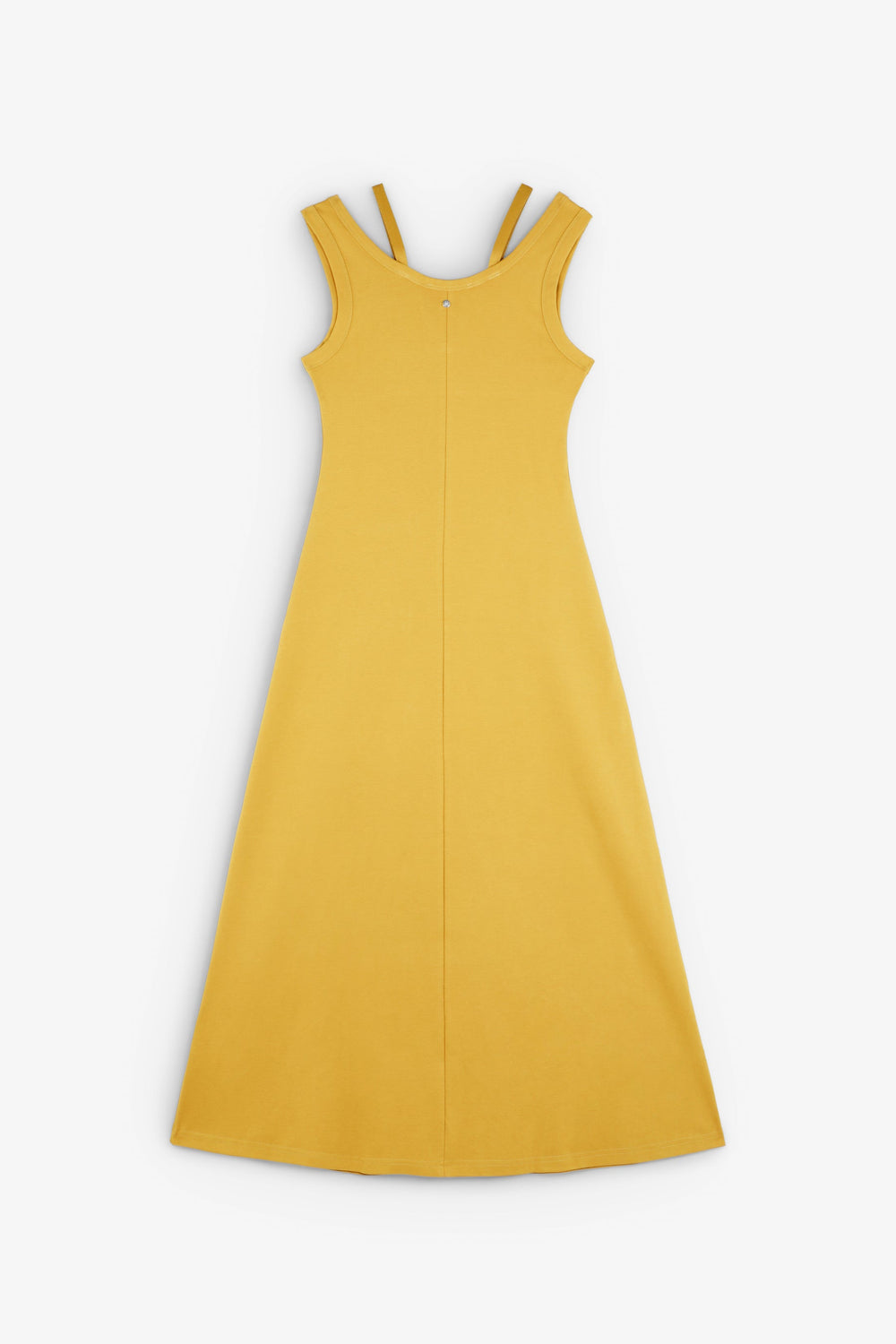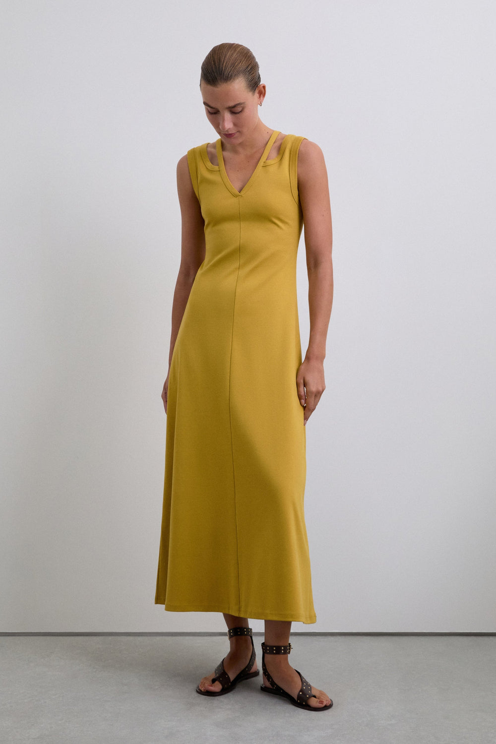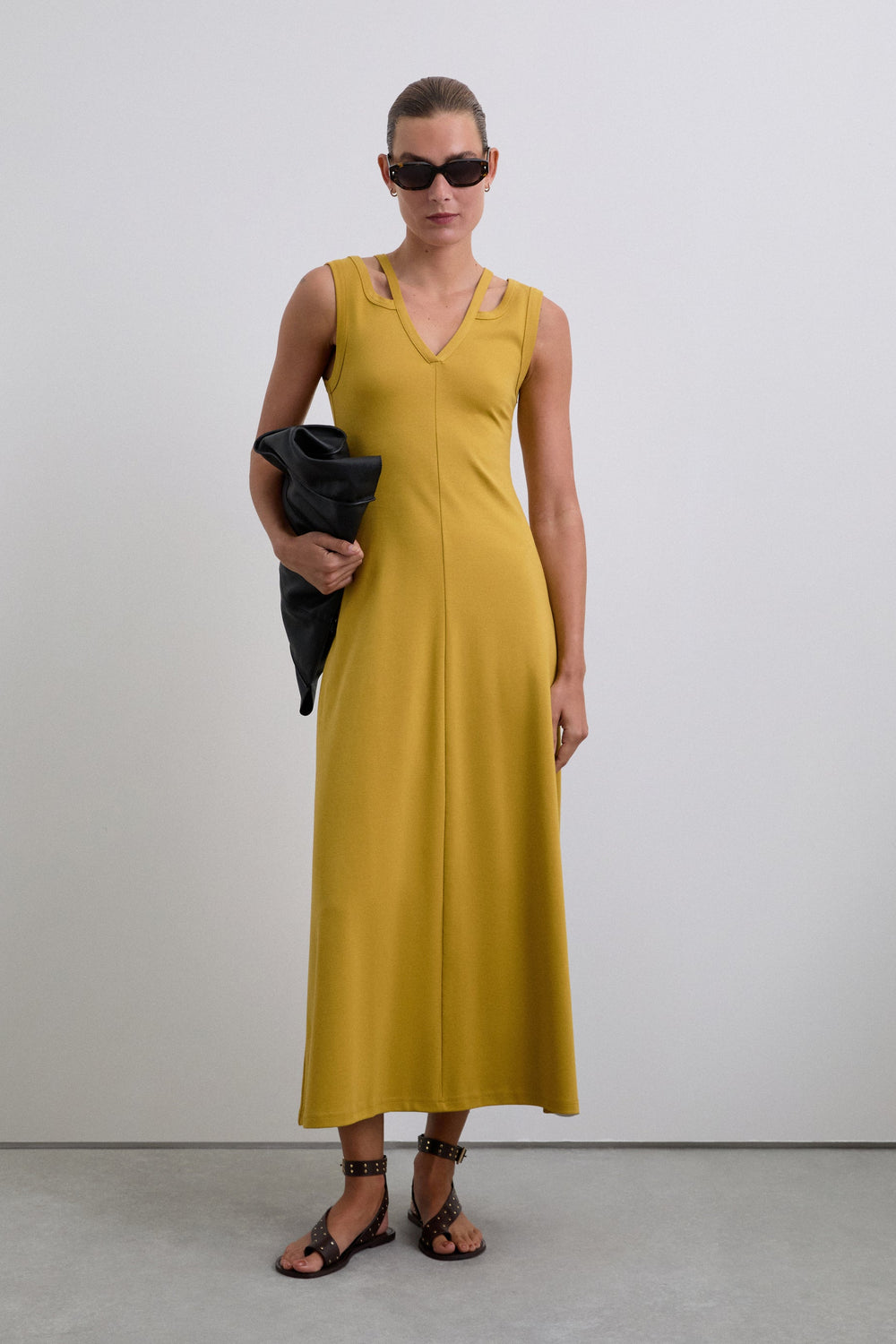 Vestido midi confeccionado en 100% Algodón Orgánico BCI. Manga en sisa. escote en V con detalles de cut outs y doble tirantes.