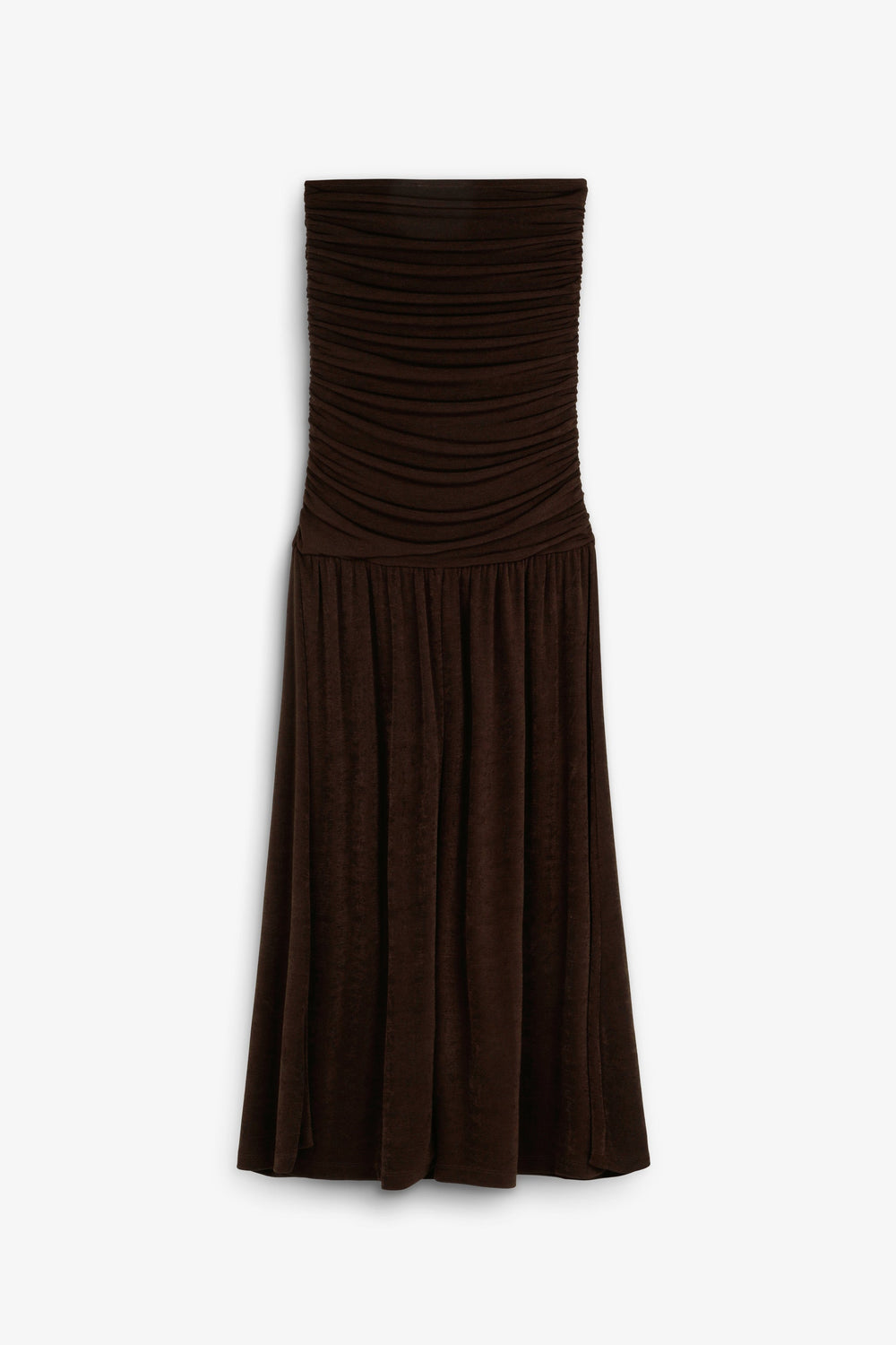 Dress made of slightly stretchy fine knit. Slim fit, strapless, gathered detail on body. Midi cut.