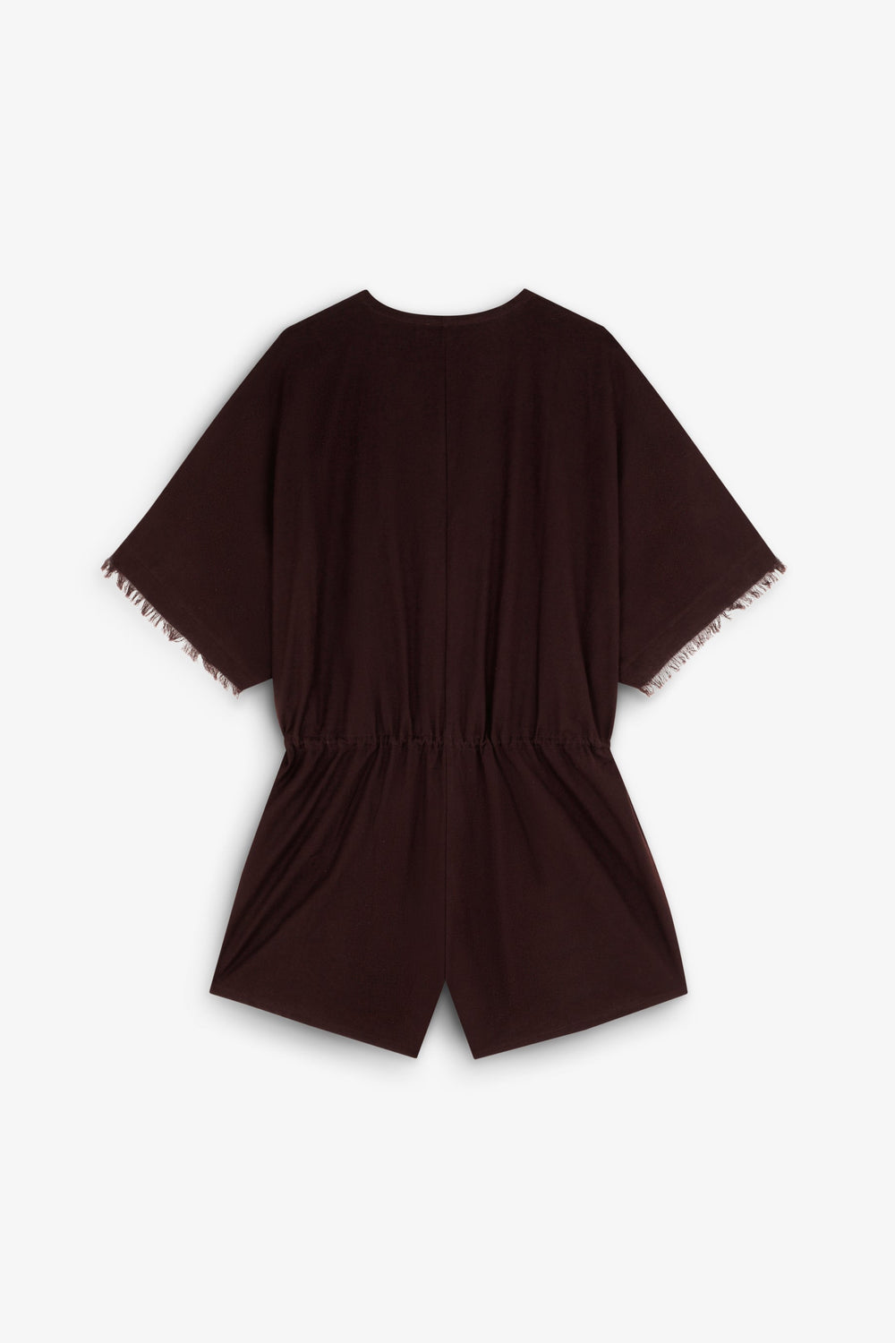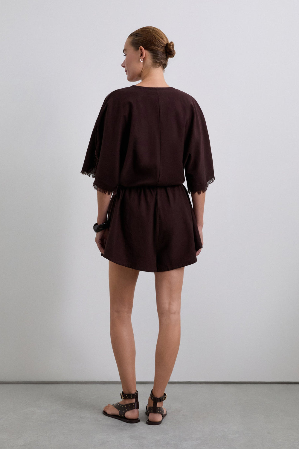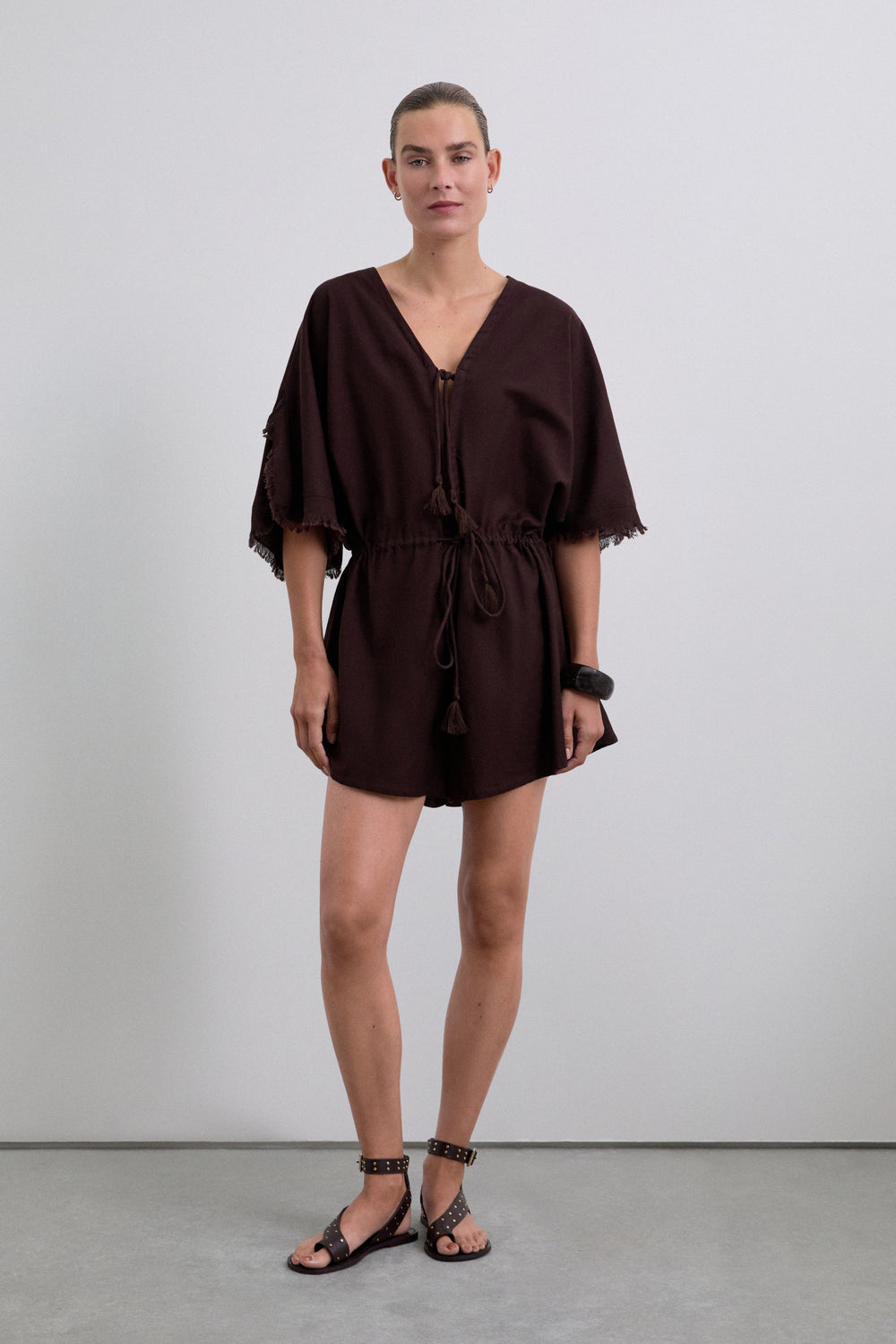 Mono confeccionado en mezcla de algodón y lino. Corte regular fit, escote en V, manga corta amplia y pantalón corto. Cintura elástica. Detalle de ajuste frontal en pecho y cintura con lazo.