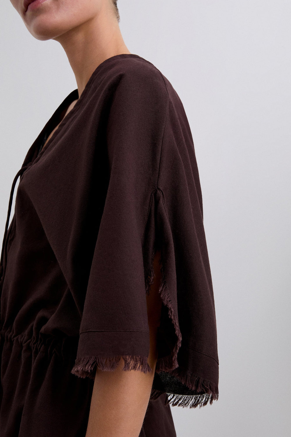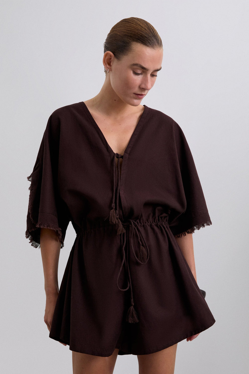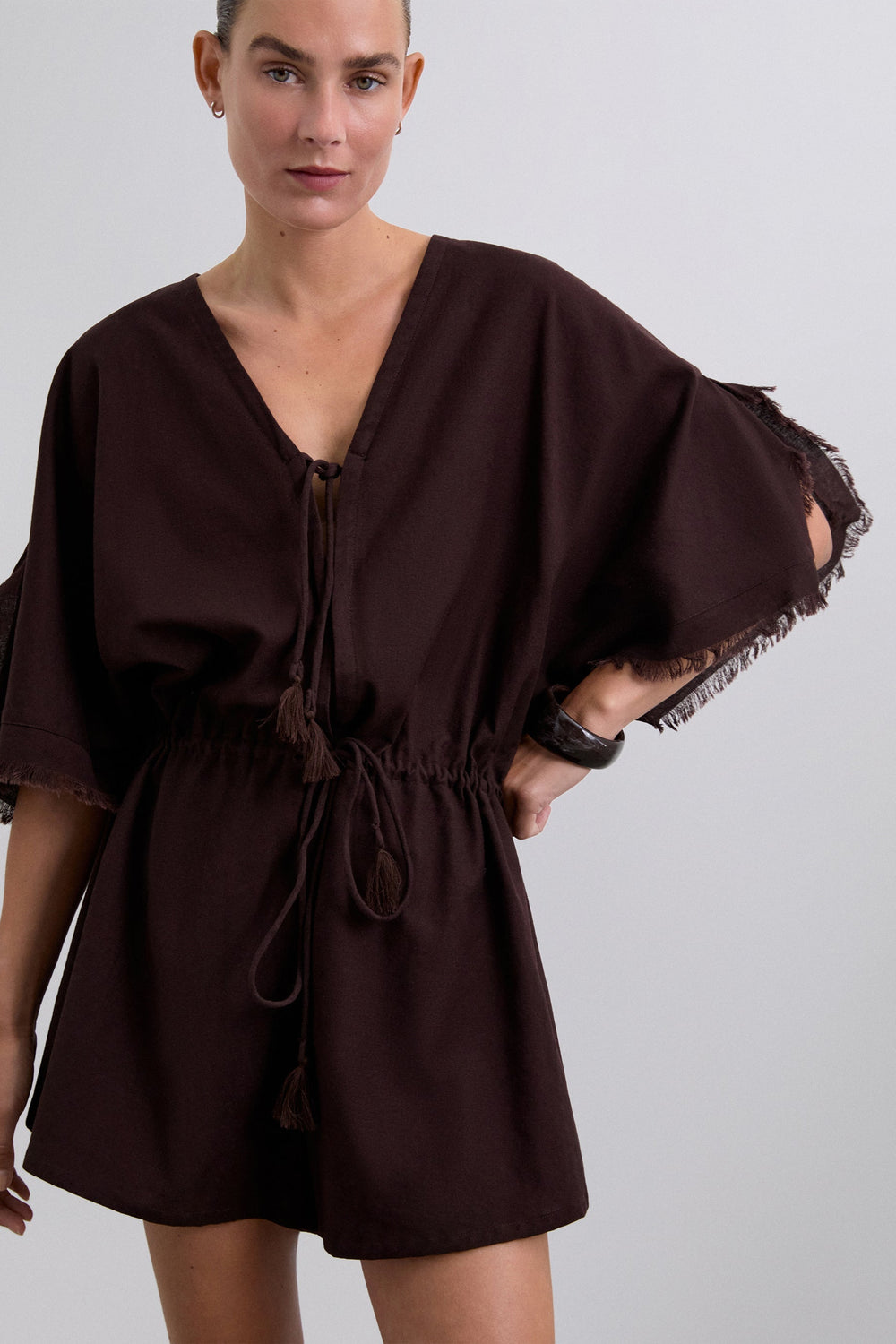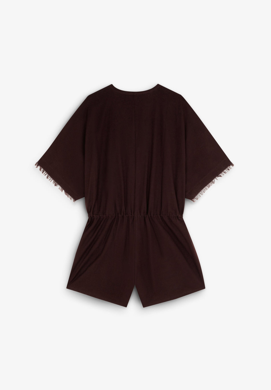 Mono confeccionado en mezcla de algodón y lino. Corte regular fit, escote en V, manga corta amplia y pantalón corto. Cintura elástica. Detalle de ajuste frontal en pecho y cintura con lazo.
