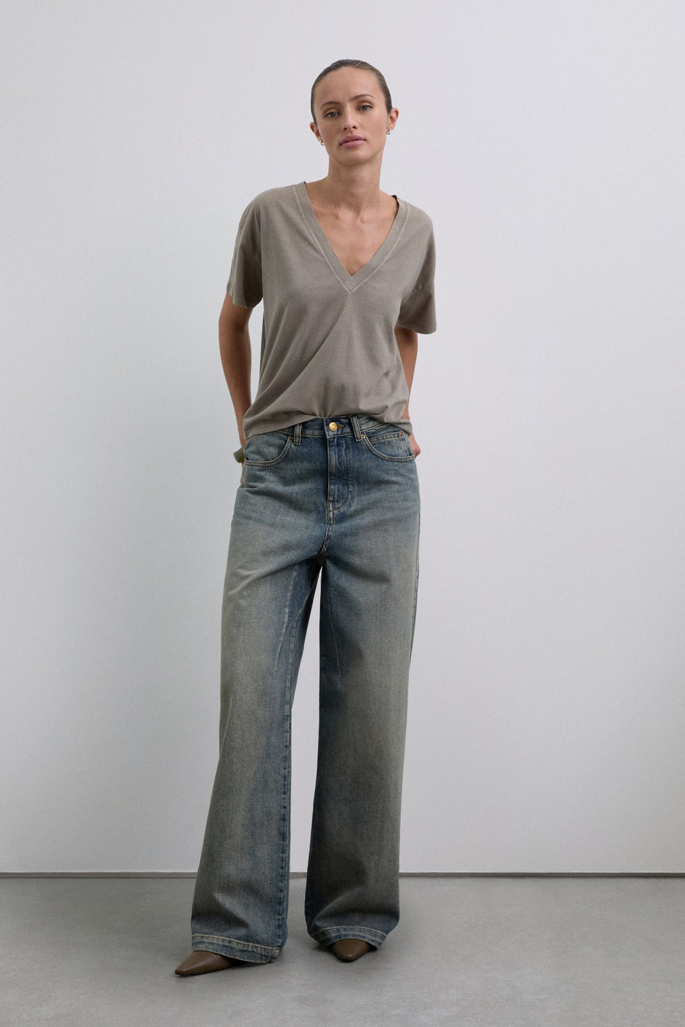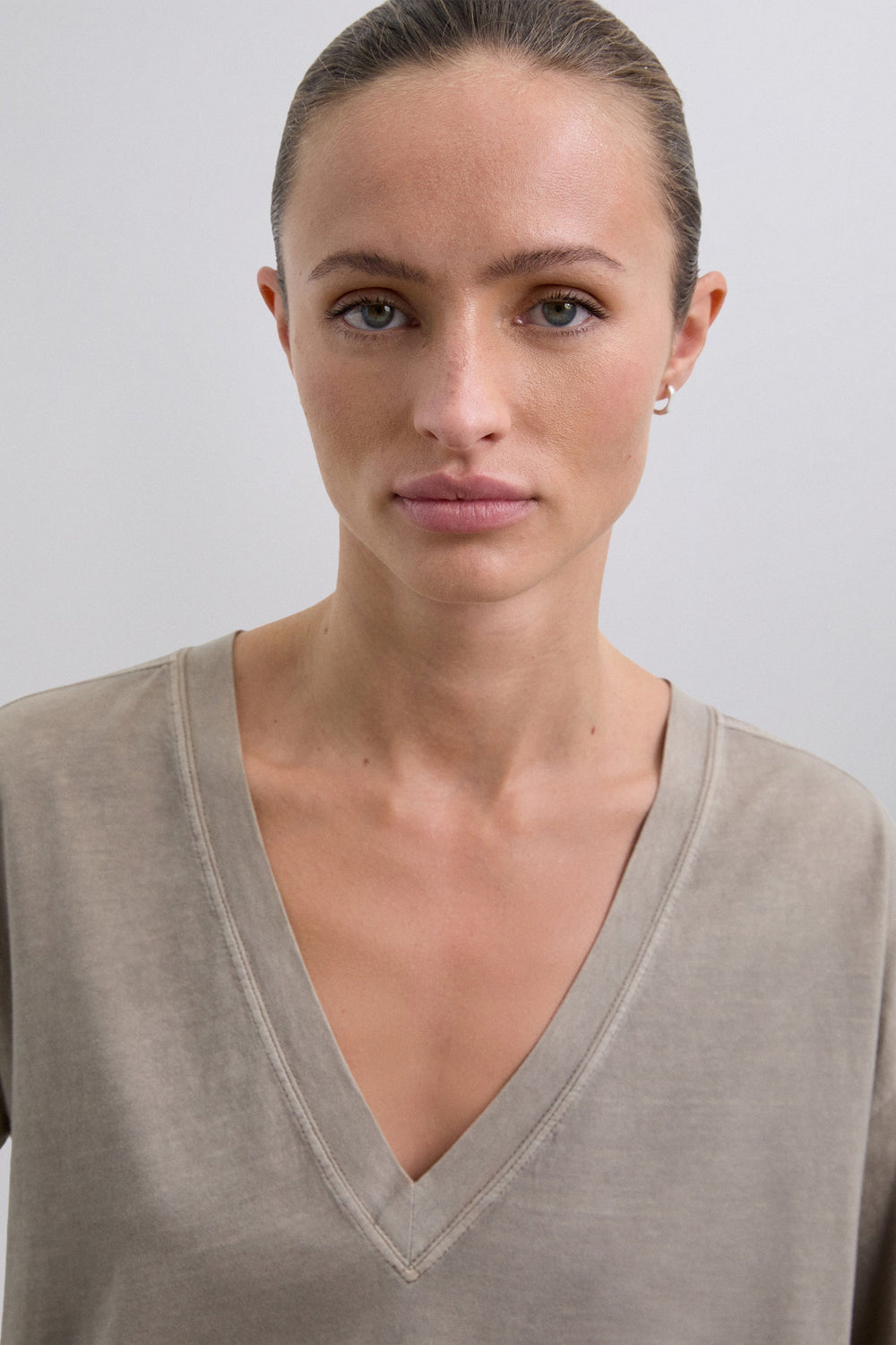 Basic T-shirt made of 100% organic cotton. Regular fit, V-neck and short sleeves. Embroidered logo detail at the lower front.