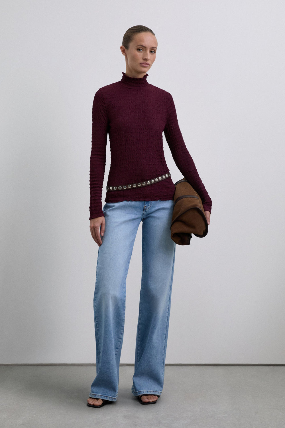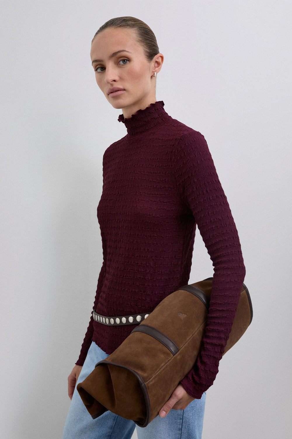 High neck top with long sleeves. Lightweight fabric with gathered texture.