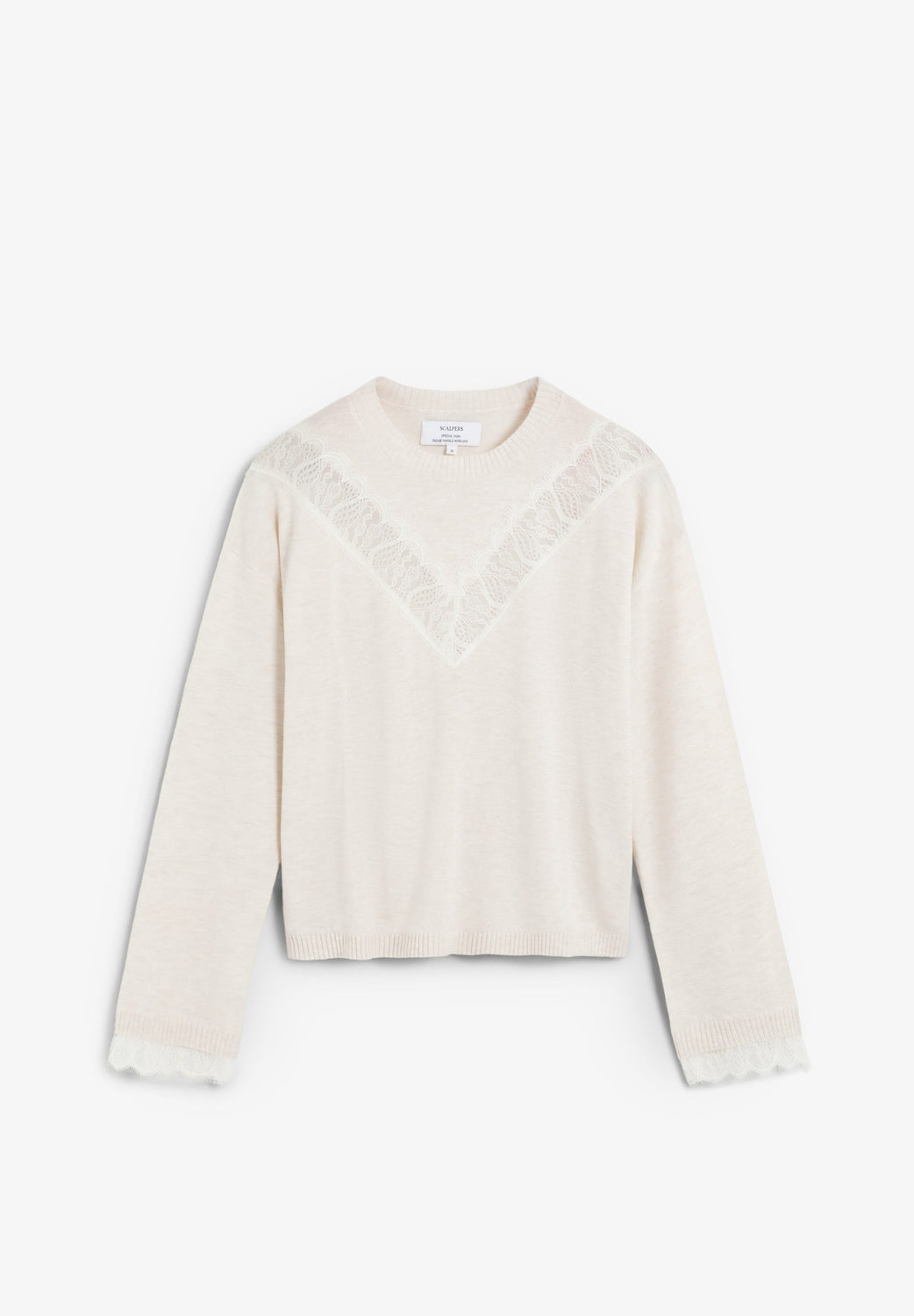 Sweater made of a wool and viscose blend. Regular fit. Round neck and long sleeves with ribbed trim. Lace details on chest and cuffs.